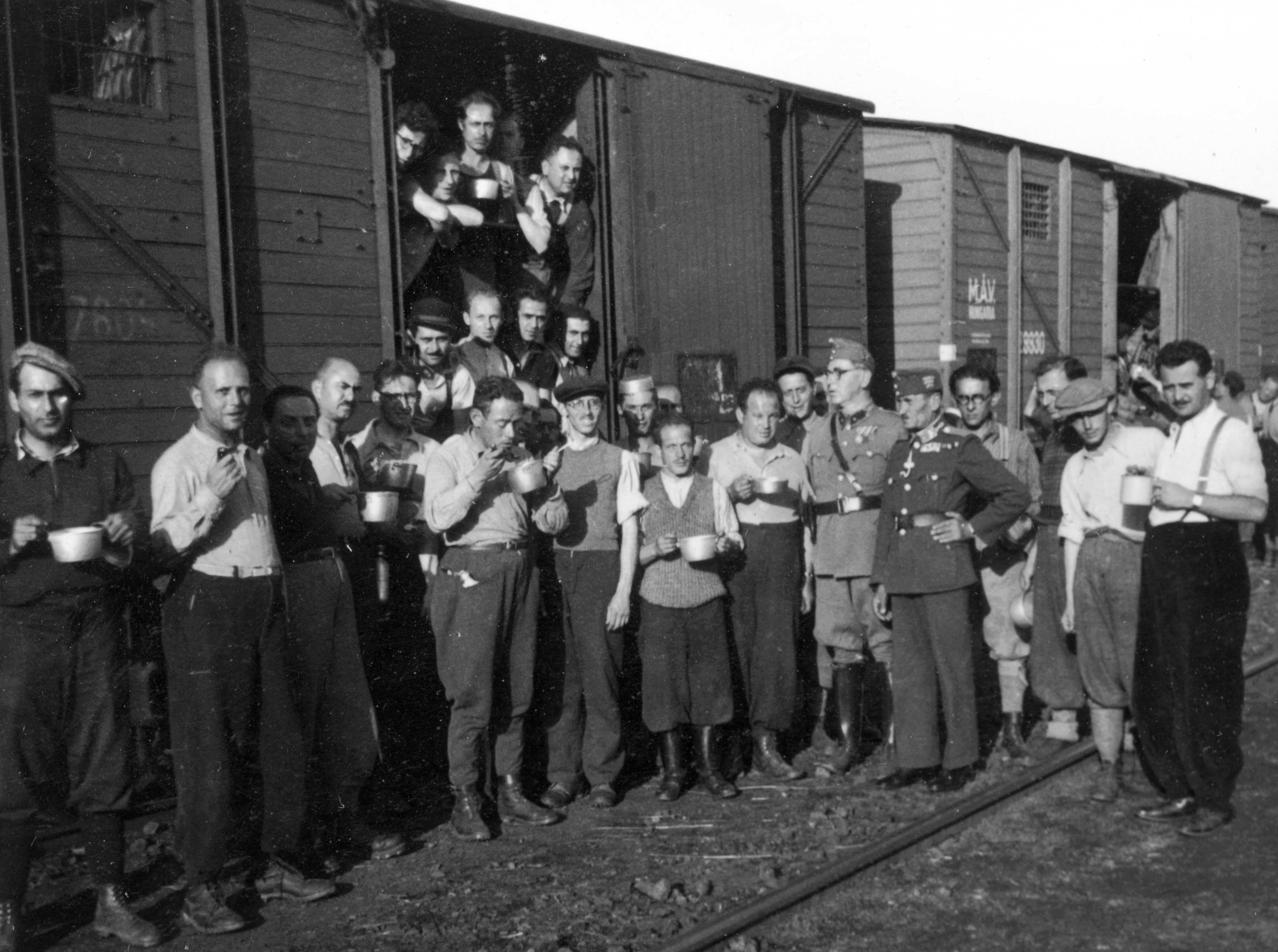 Munkaszolgálatosok és tisztjei étkezés közben a vagonnál