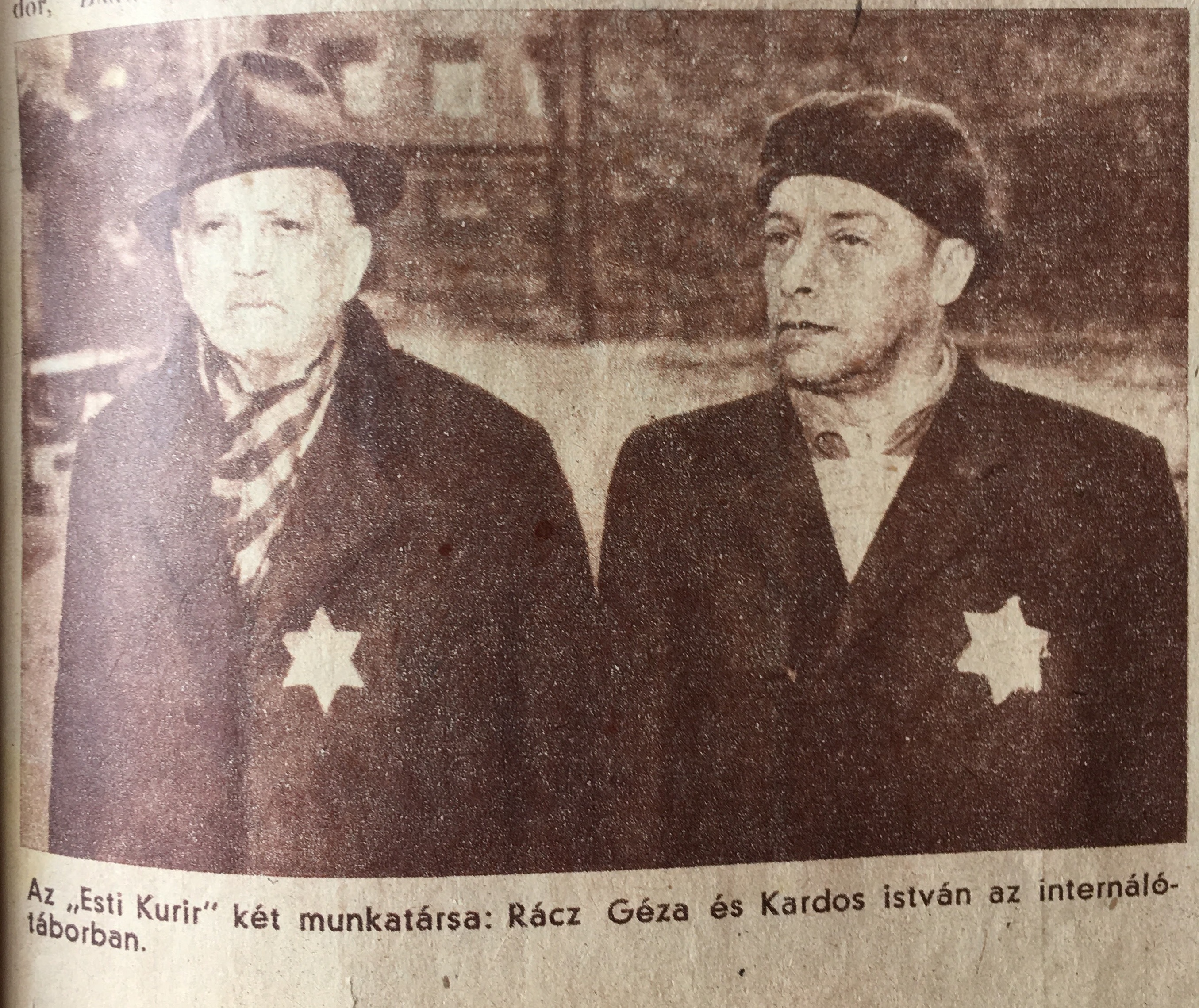 Text reads: "Two journalists of the 'Esti Kurir': Géza Rácz and István Kardos in the internment camp." Published in Zoltán Bosnyák's pro-Arrow Cross paper "Harc" [Struggle].