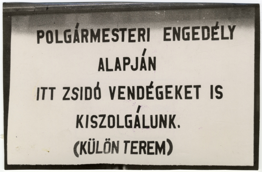 "Polgármesteri engedély alapján itt zsidó vendégeket is kiszolgálunk. (Külön terem)" "Magyar Futár Nyomdába 1944 máj 25." bélyegző a hátoldalon