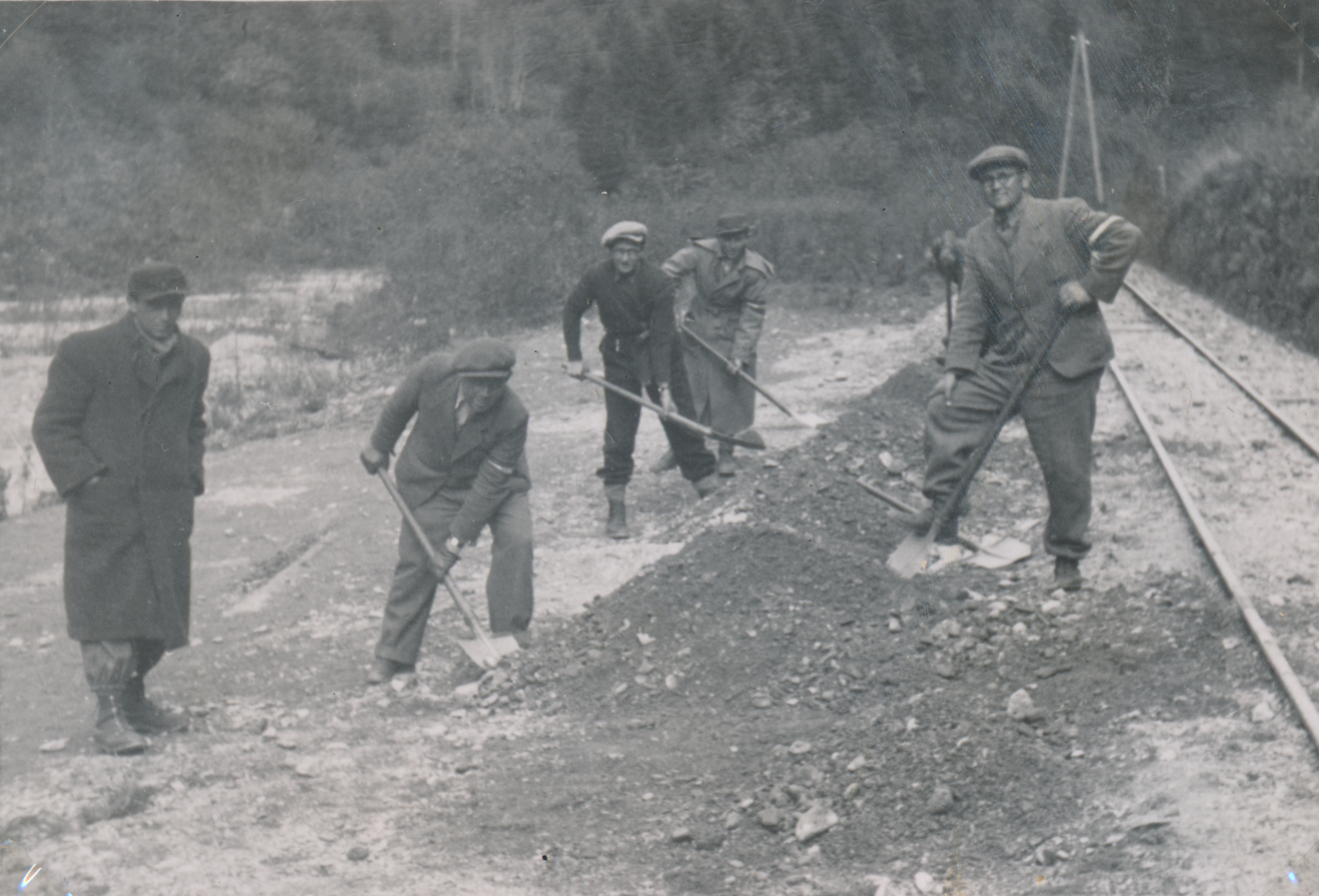 Munkaszolgálatosok sódert lapátolnak a a vasúti síneknél