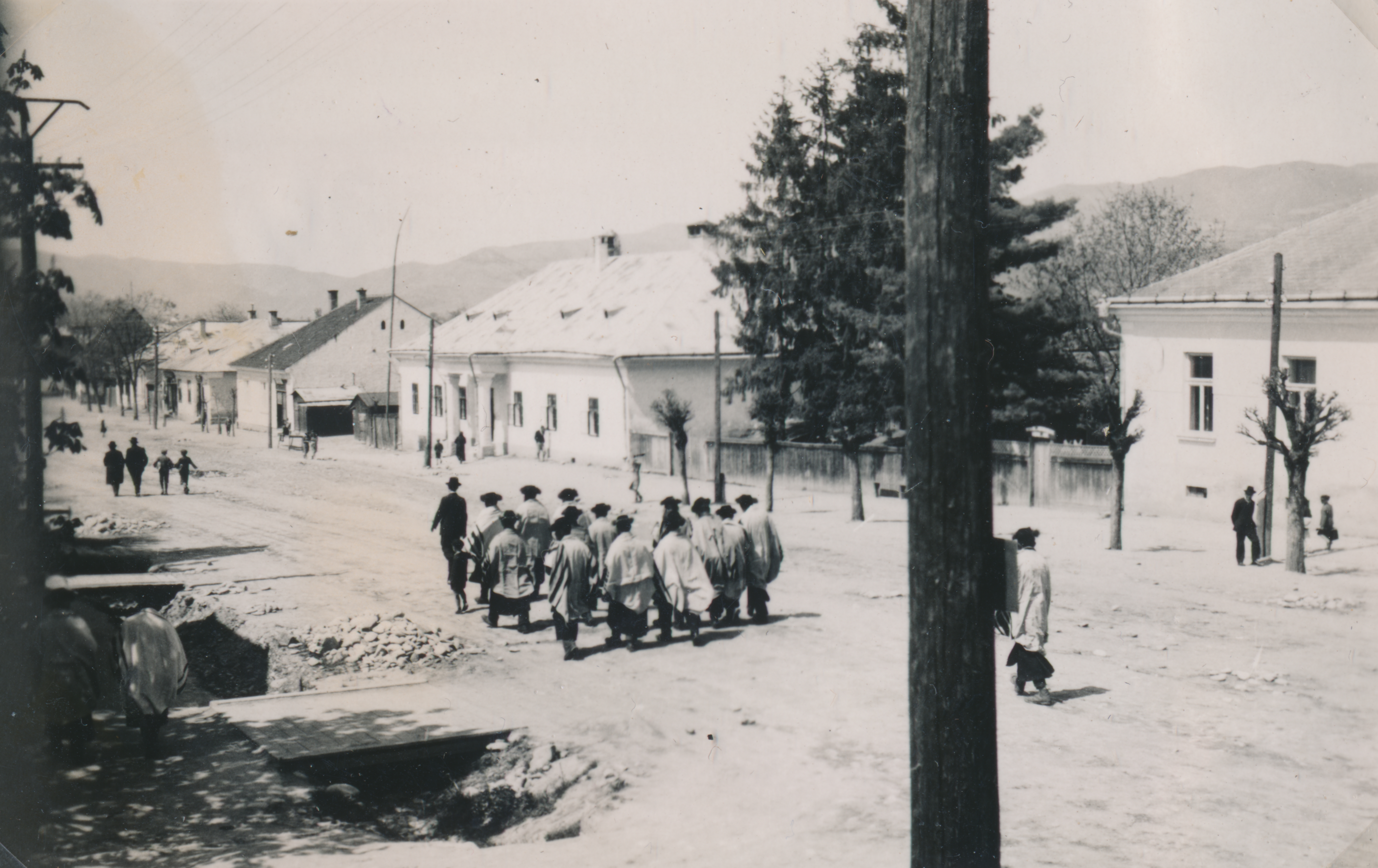 Orthodox zsidó férfiak sétálnak egy erdélyi falu utcáján egy zsidó ünnepen