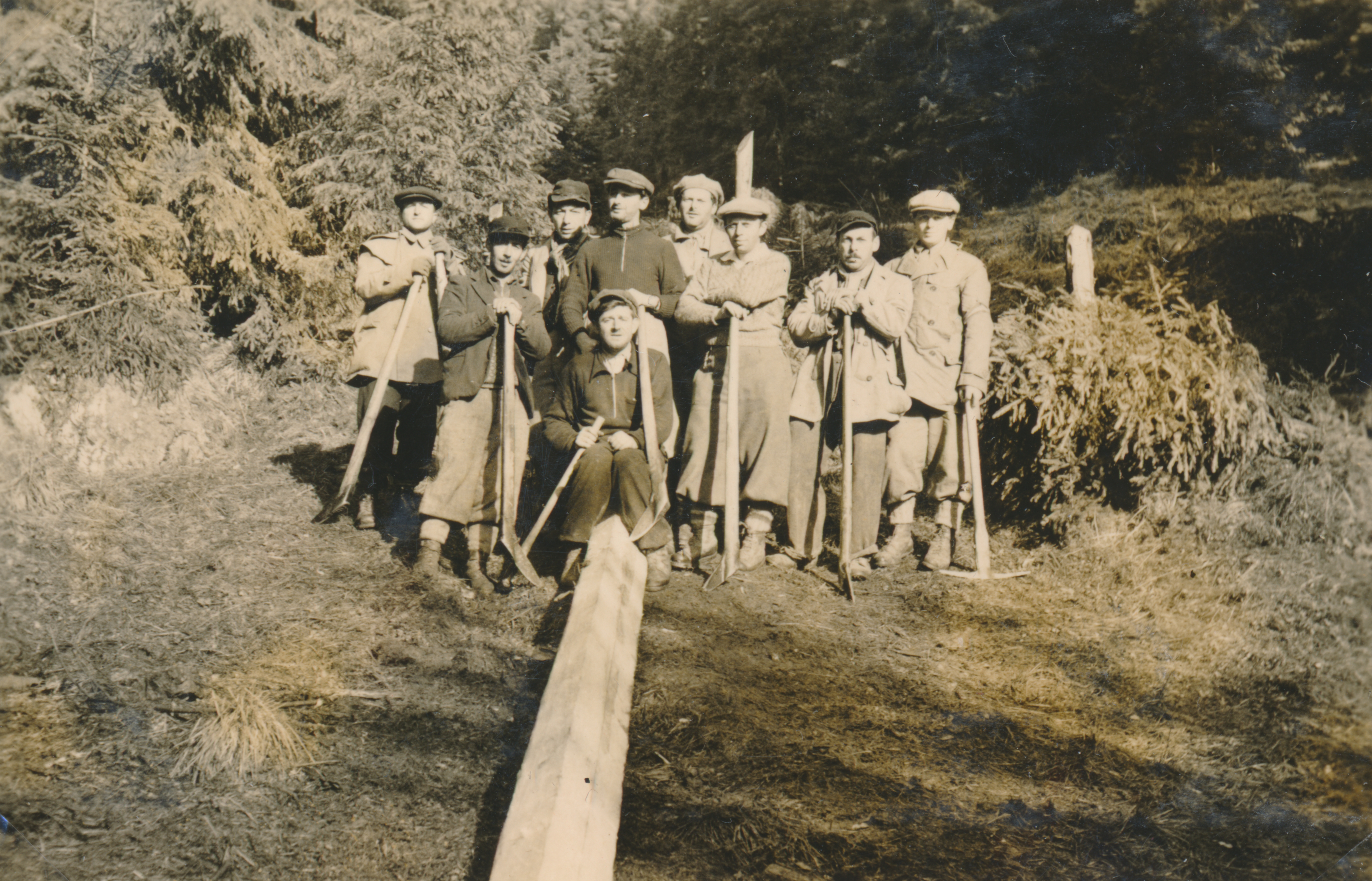 Csoportkép munkaszolgálatosokról szerszámokkal és egy fagerendával