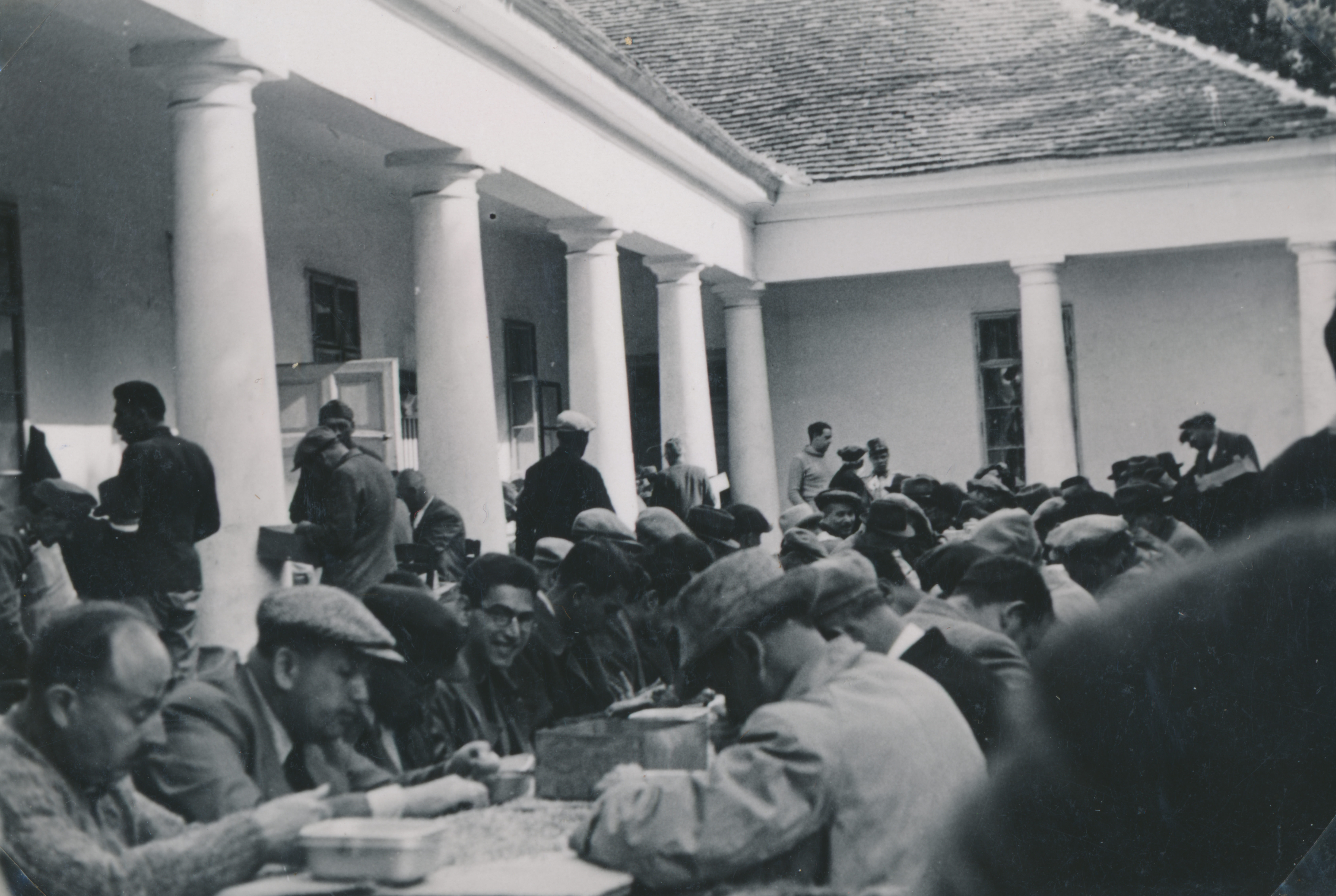 Munkaszolgálatosok borsót válogatnak a szabadban az udvaron felállított hosszú asztaloknál 1