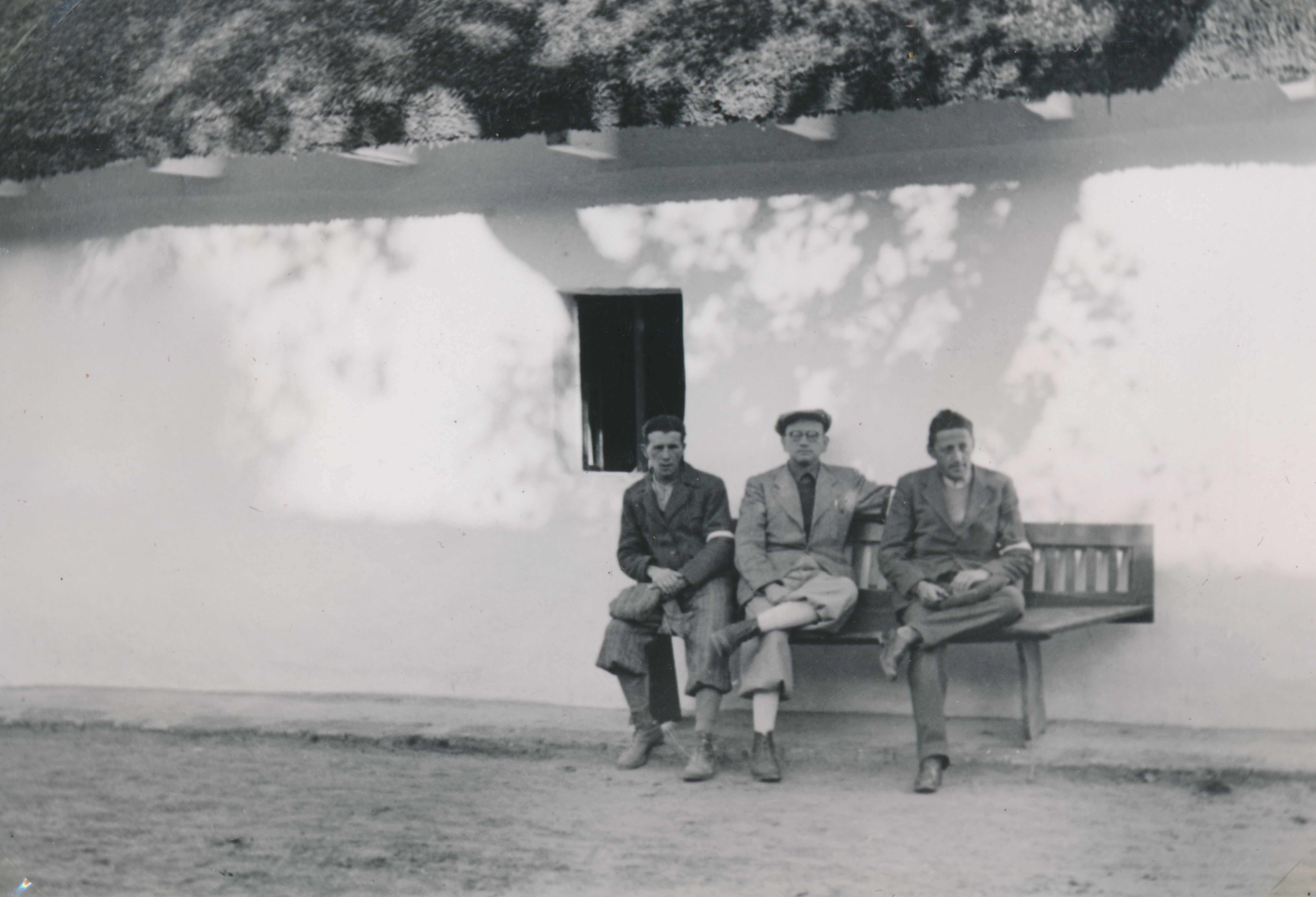 Három munkaszolgálatos (Vig Farkas, Spitzer Dénes, Lőwinger László) ül egy padon a tető alatt