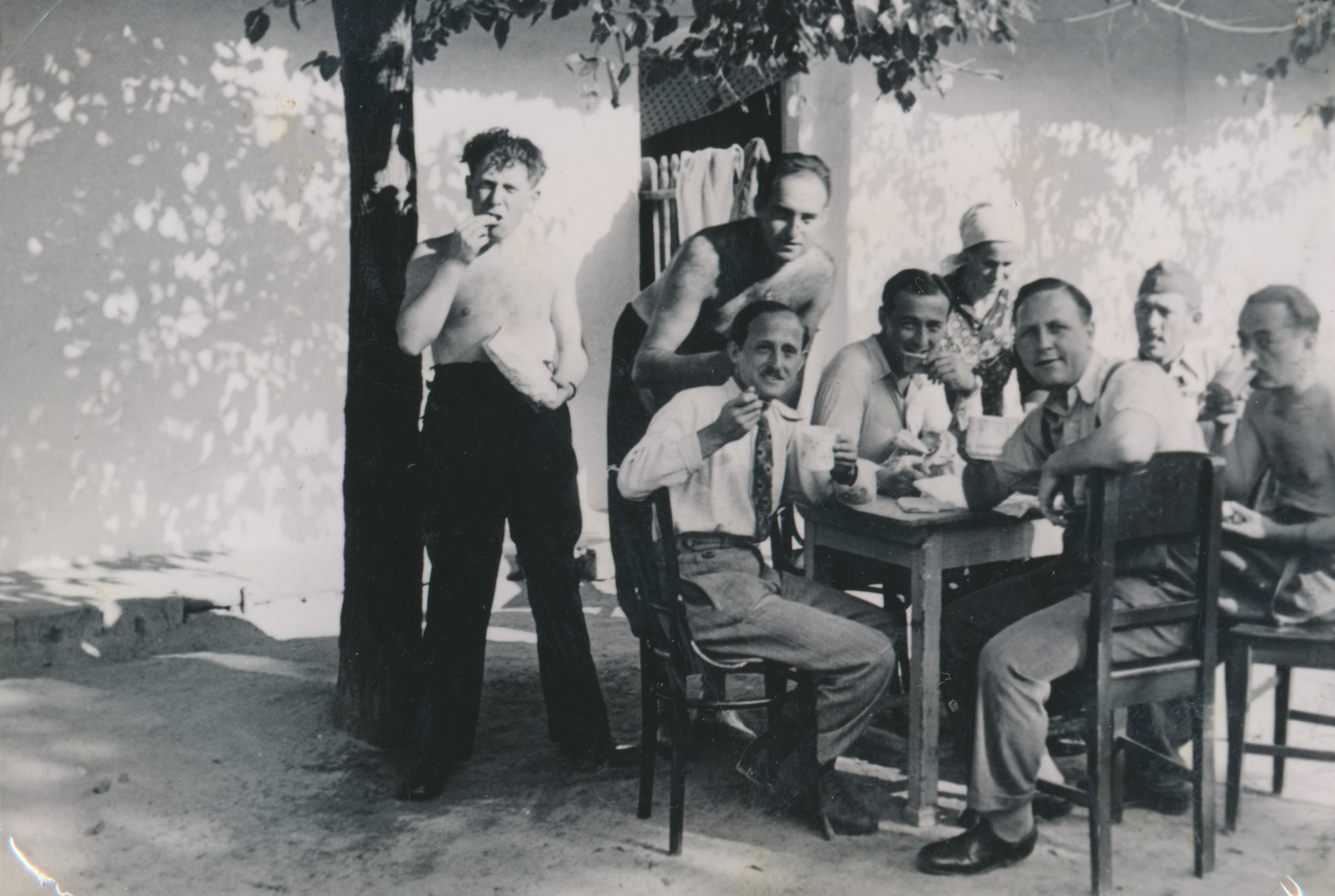 Hét munkaszolgálatos eszik a szabadban egy udvaron