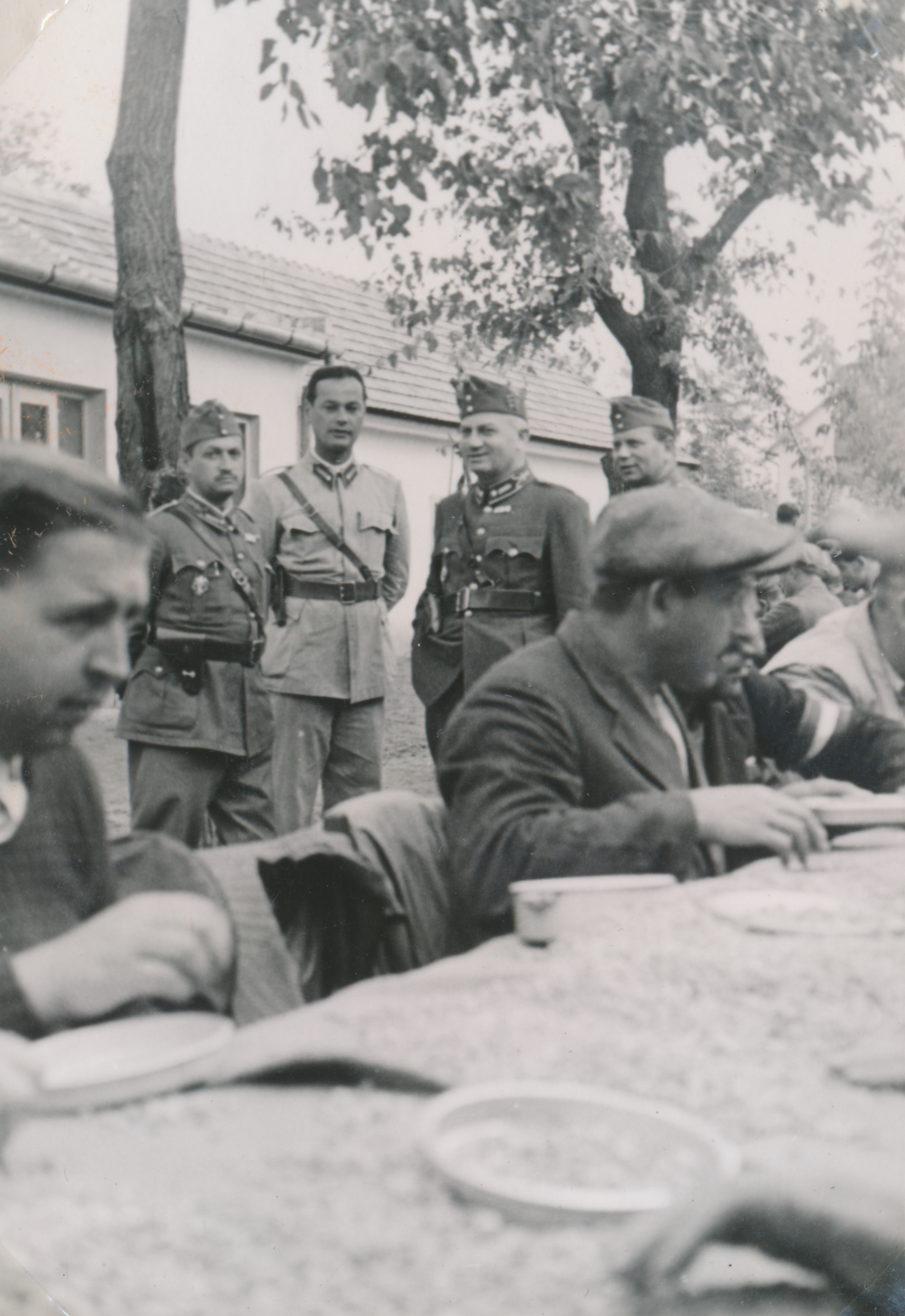 Négy tiszt nézi, ahogy a munkaszolgálatosok borsót válogatnak