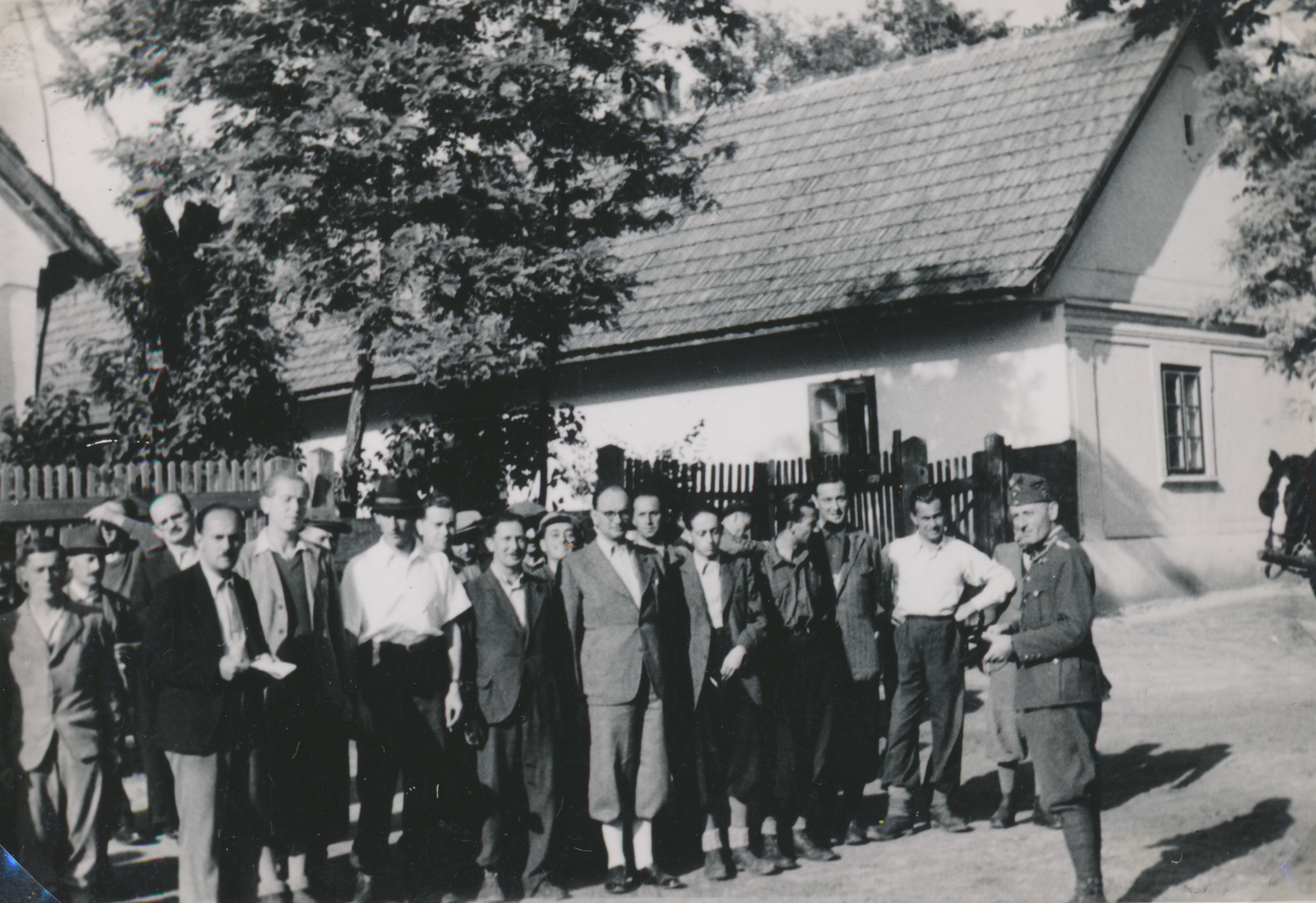 Csoportkép a munkaszolgálatosokról (3. század) és egy tisztről egy falusi ház előtt