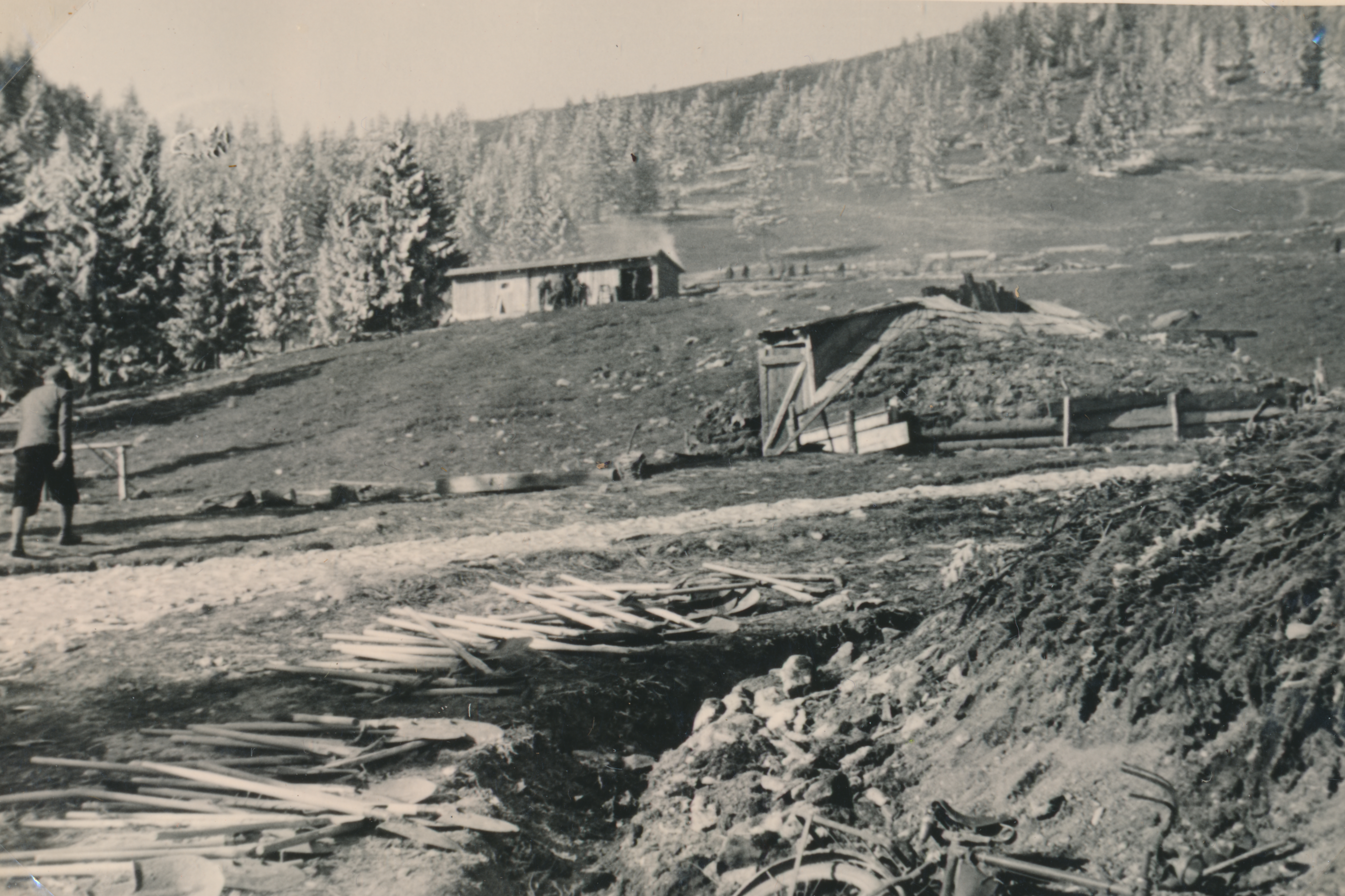 Kajiba (munkaszolgálatosok lakhelye) és a tiszti lak egy hegyoldalban