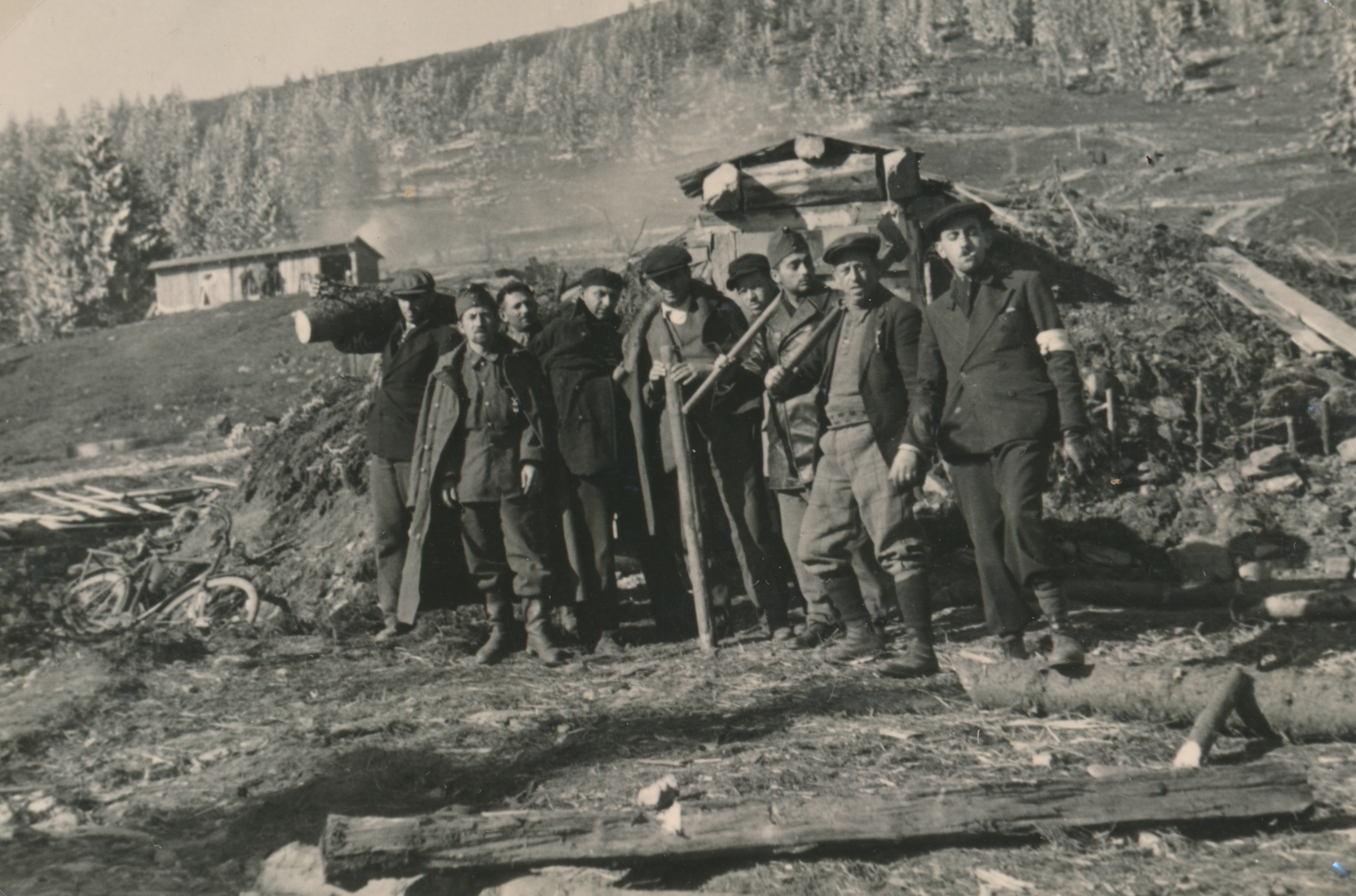#munkaszolgálat #egyenruha #csoportkép #hegy #ház #civilruha #farönk #tiszt #bicikli #kunyhó #balta KARSZALAG