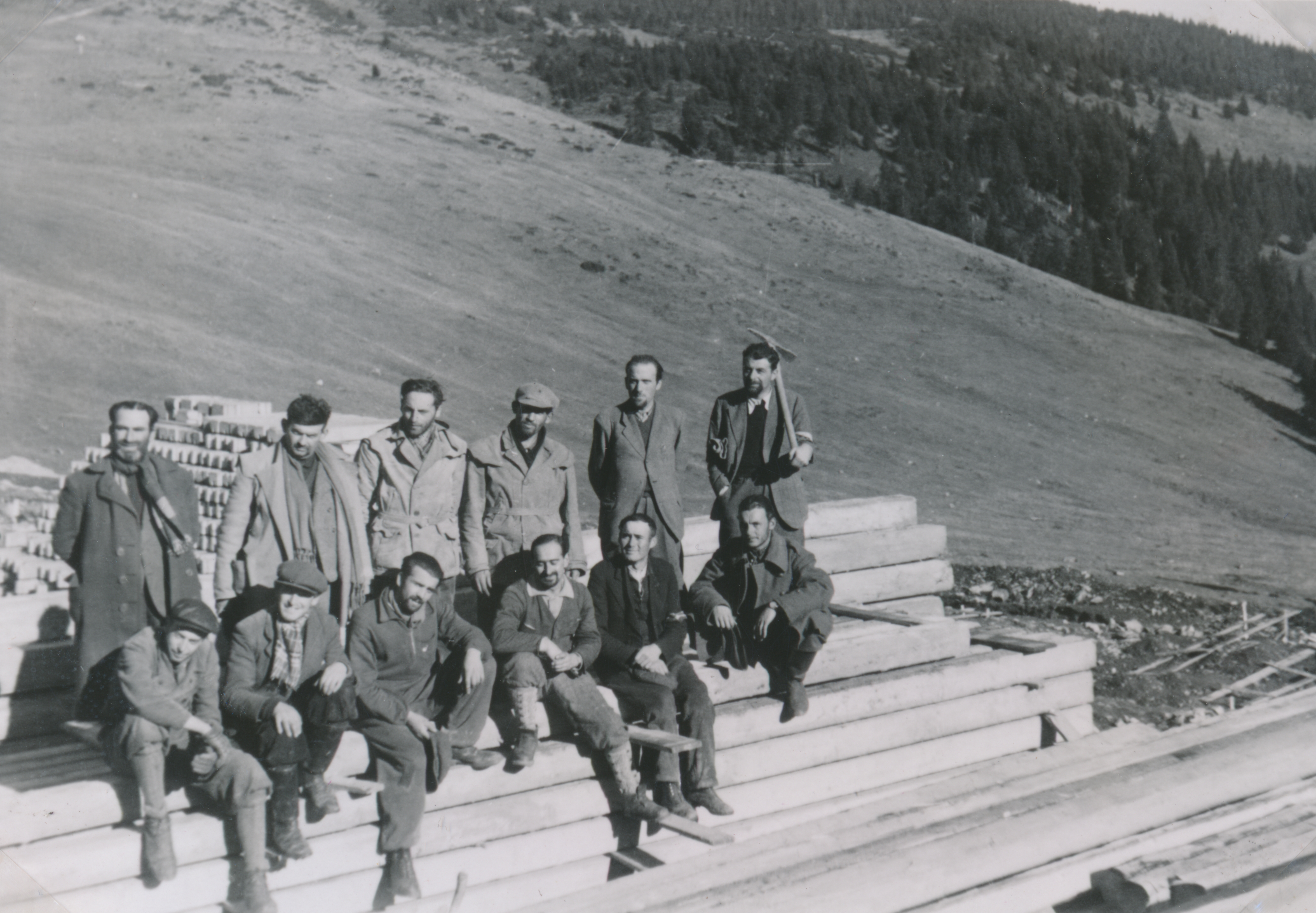 Csoportkép munkaszolgálatosokról fagerendákon