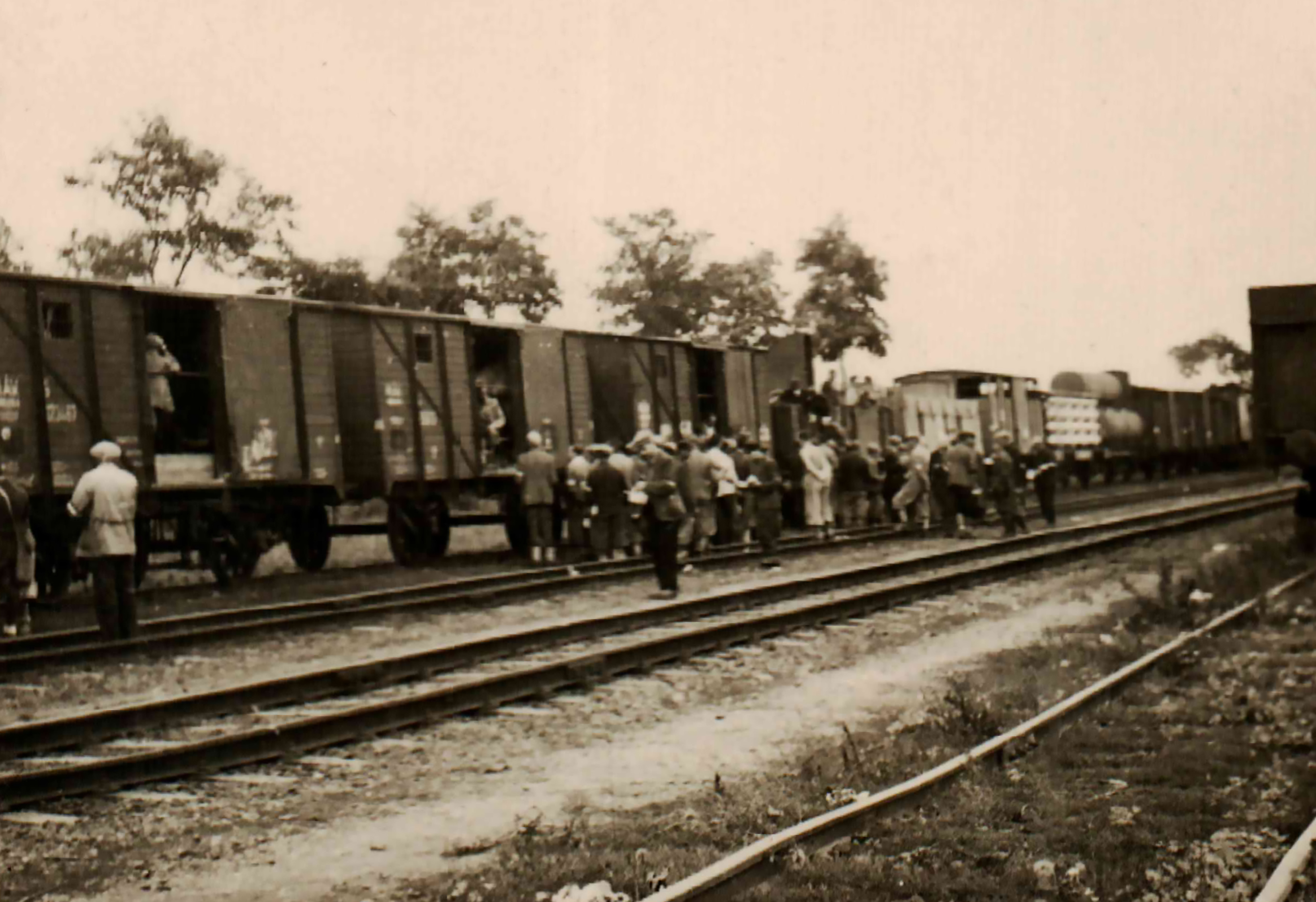 Munkaszolgálatosok marhavagonok előtt