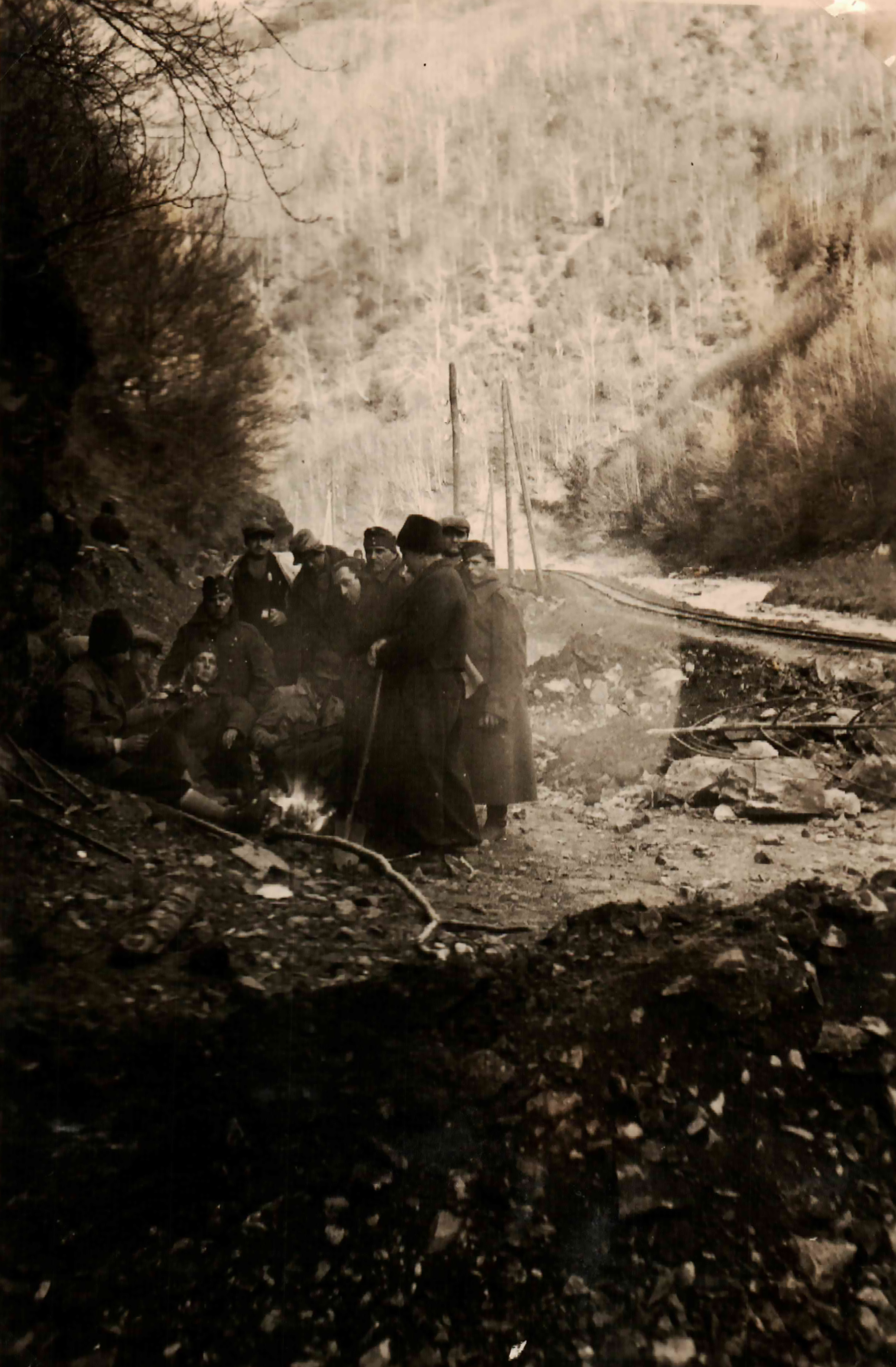 Munkaszolgálatosok pihennek egy vasúti sín közelében