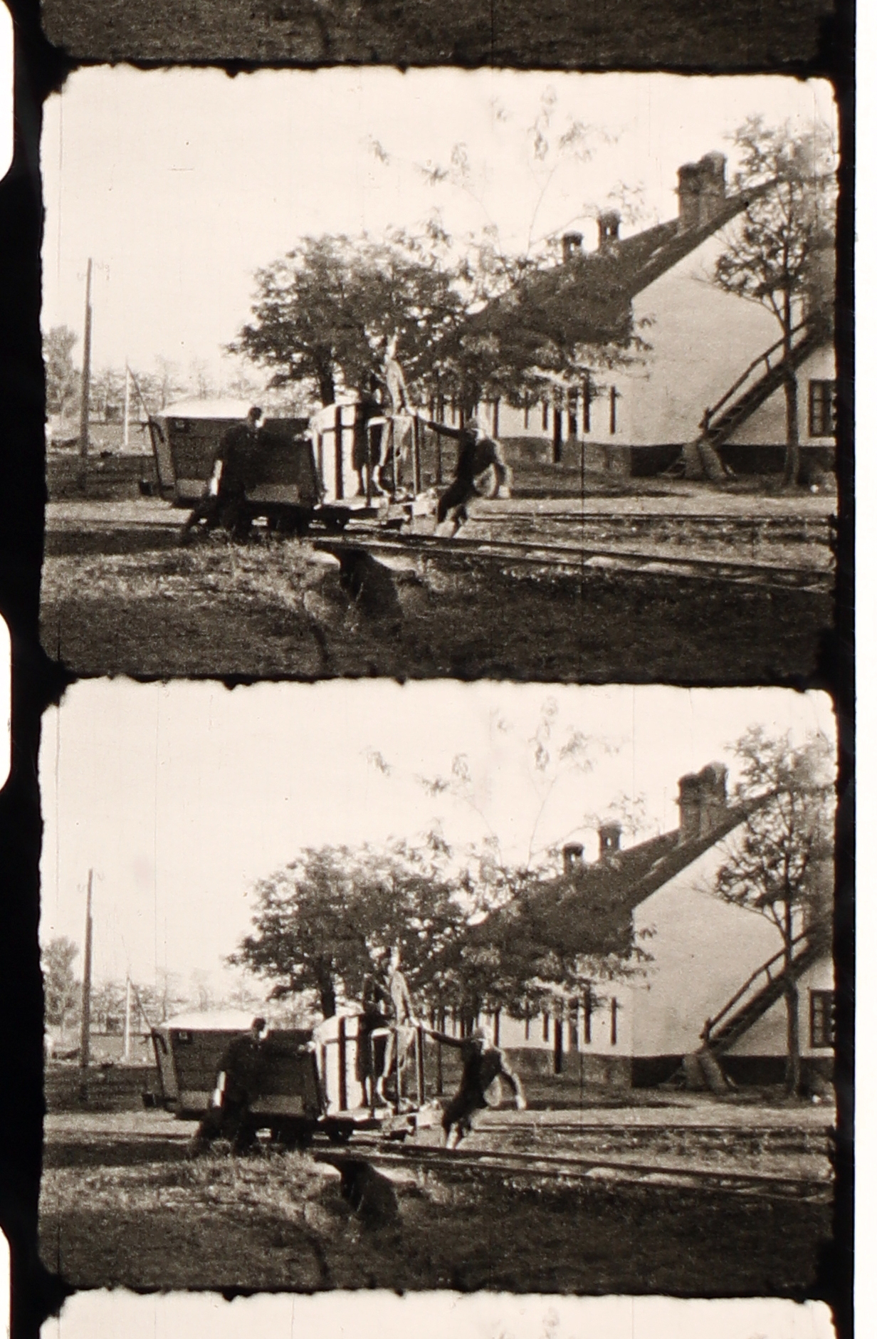 Munkaszolgálatosok egy lórét húznak, amelyen egy őr áll