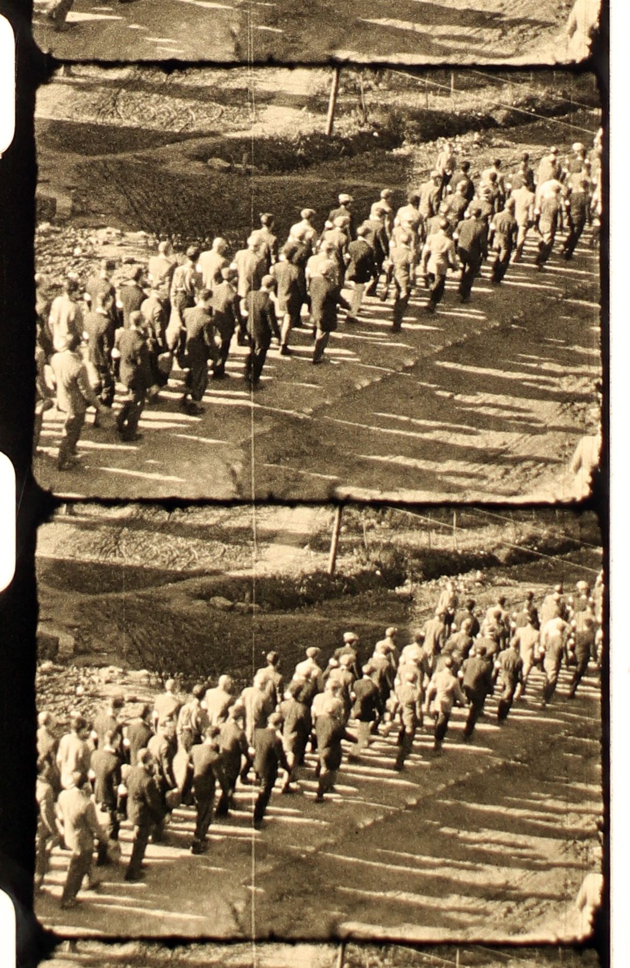 Munkaszolgálatosok menetelnek négyes sorban I.