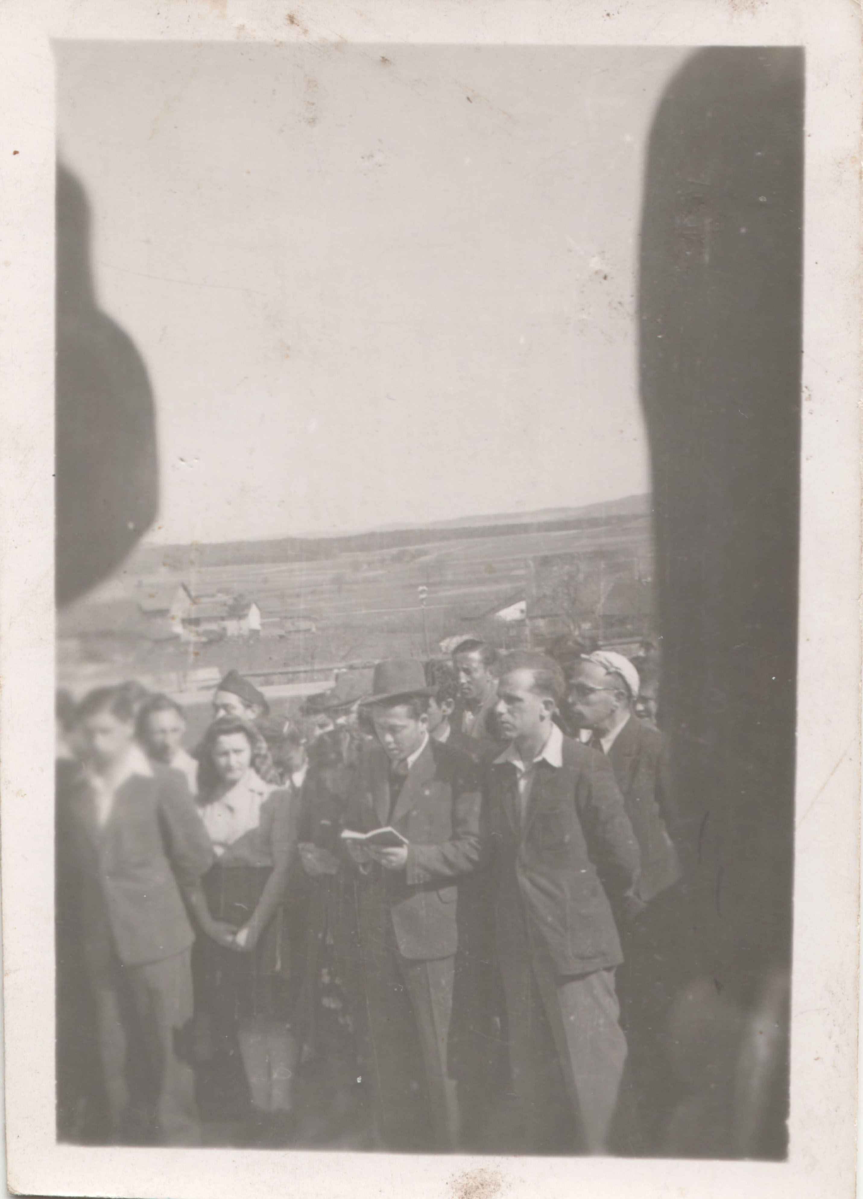 Csoportkép imádkozó emberekről az egykori kényszermunkatábor helyszínén