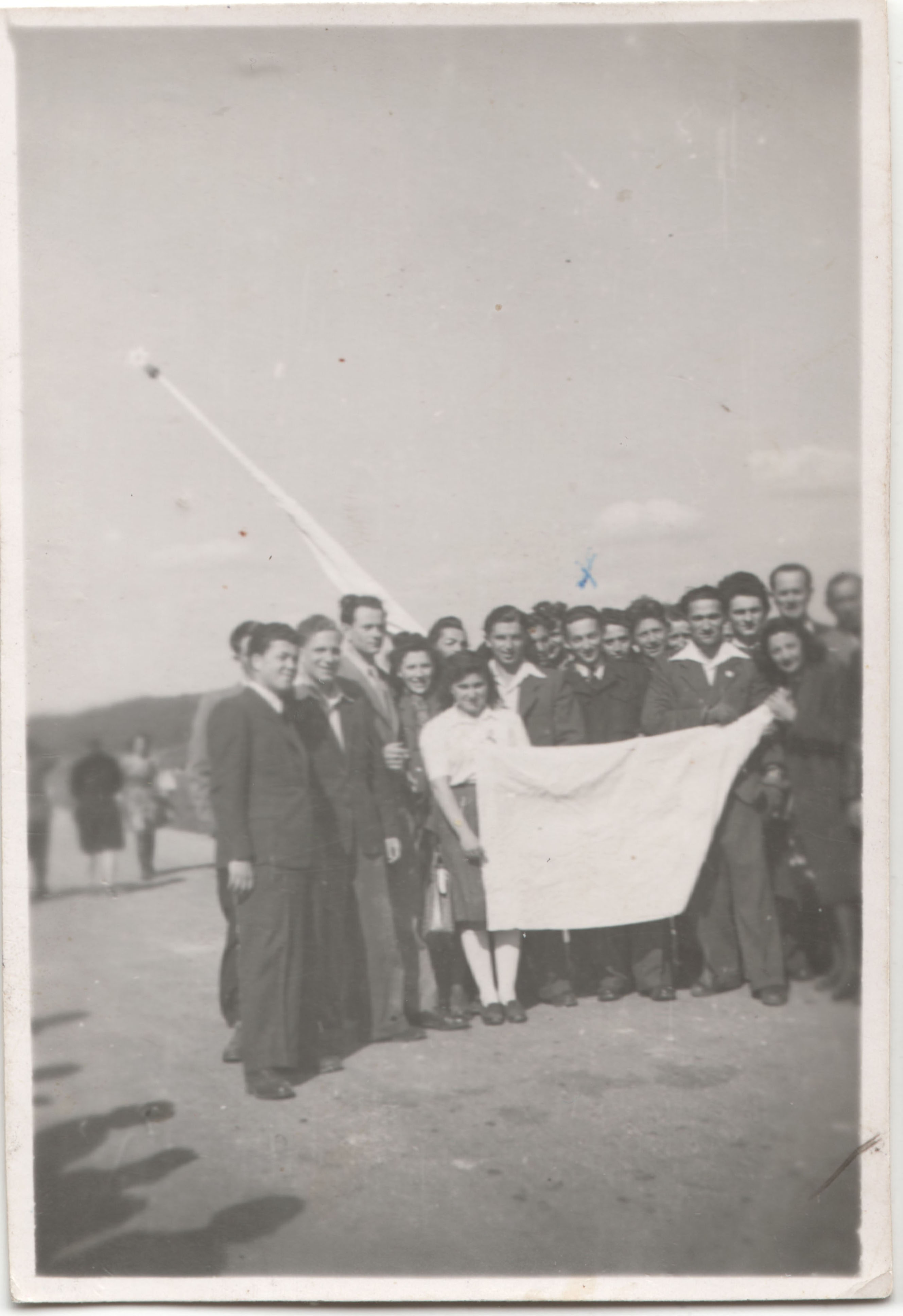 Emlékezők egy csoportja fehér zászlóval (feliratos lepellel), az egykori deportálás helyszínén