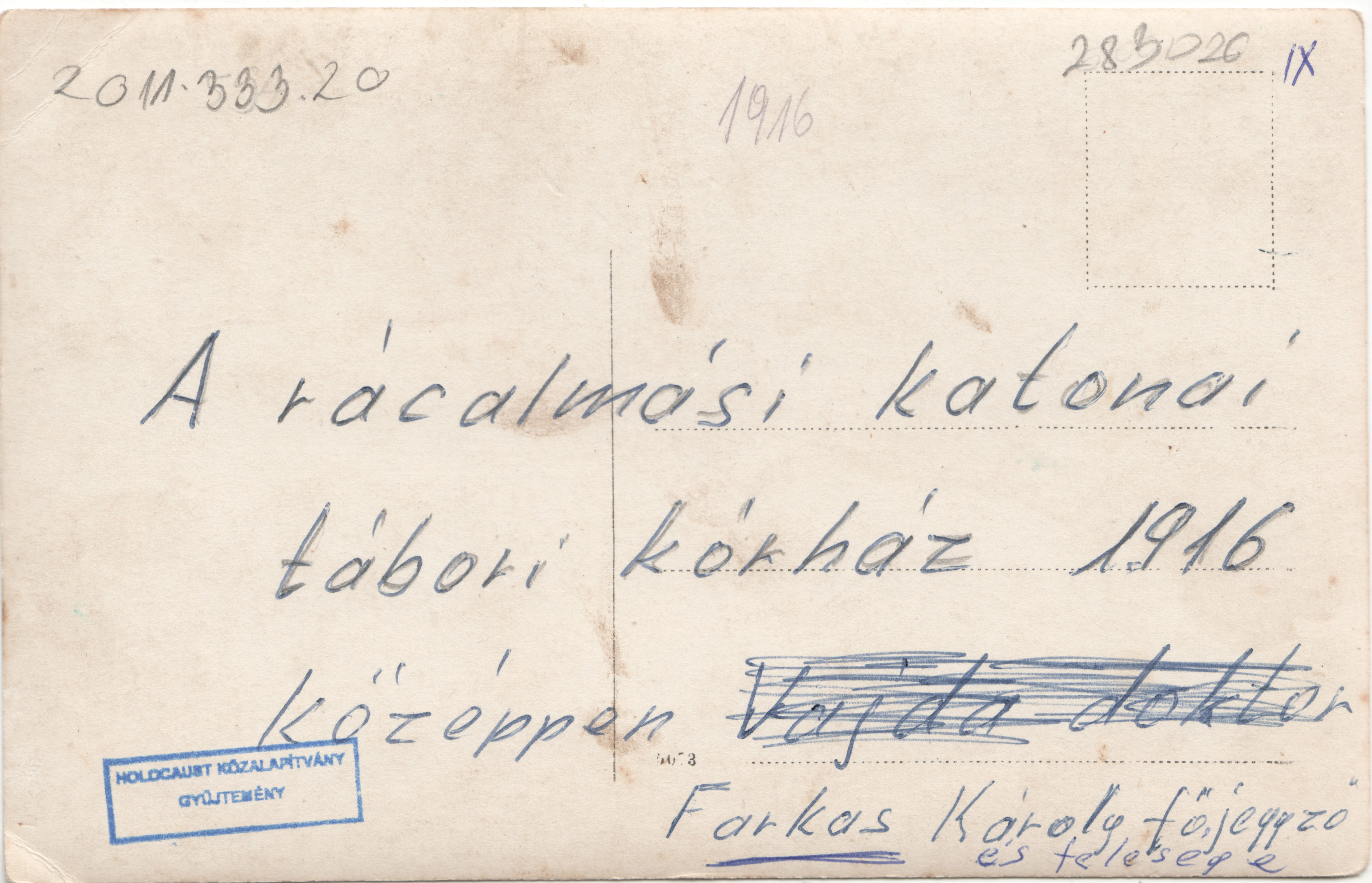 A rácalmási katonai tábori kórház kép hátoldalán kézzel írt szöveg