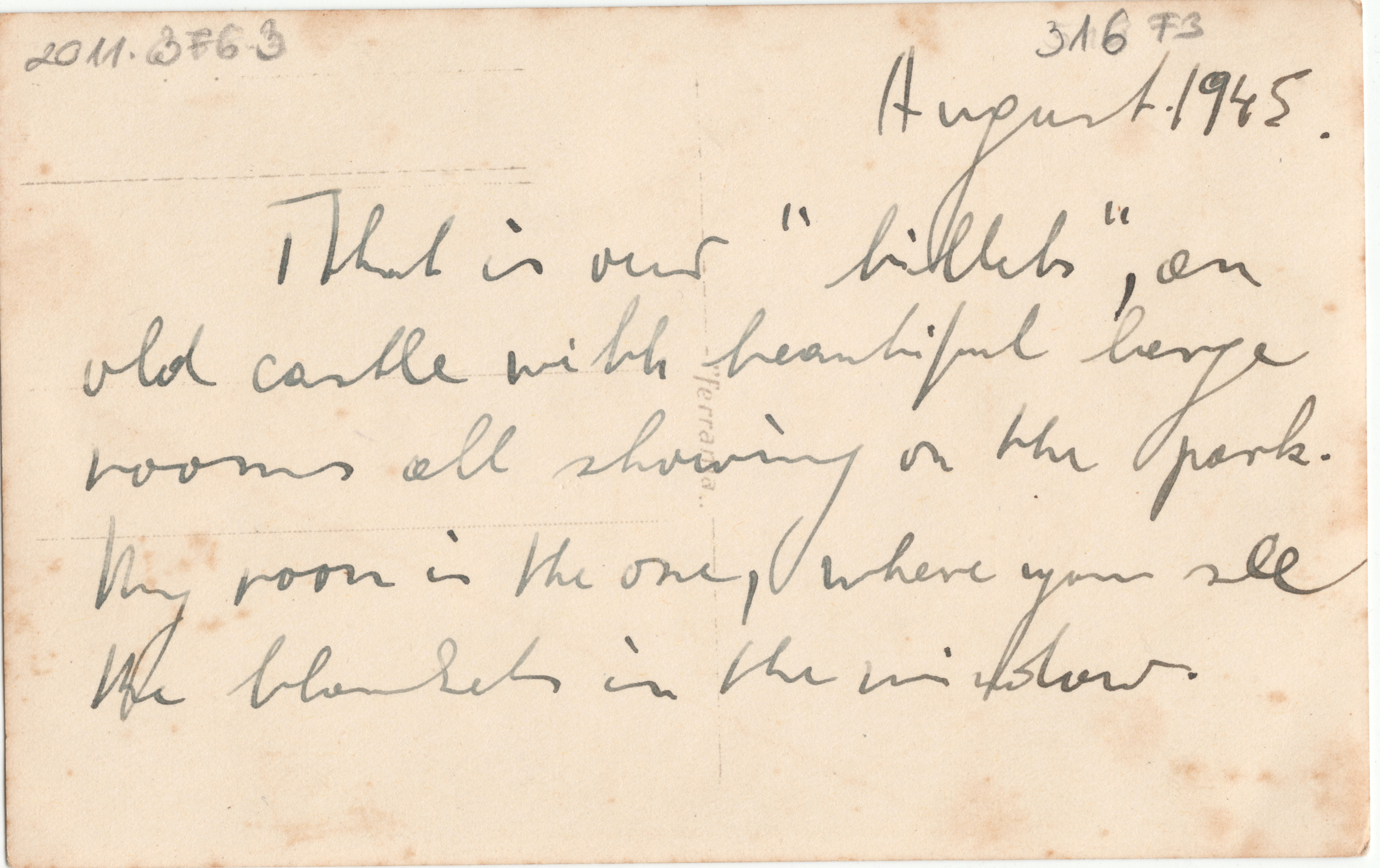 Angol szöveg: “August 1945. That is our ‘kibbutz’, an old castle with beautiful large rooms all showing on the park. My room is the one, where you see the [illegible] in the window.” Magyarul: "1945 augusztus. Ez a mi "kibucunk", egy régi kastély, gyönyörű, nagy szobákkal, amelyek a parkra néznek. Az én szobám az ahol az [olvashatatlan] látod az ablakban."