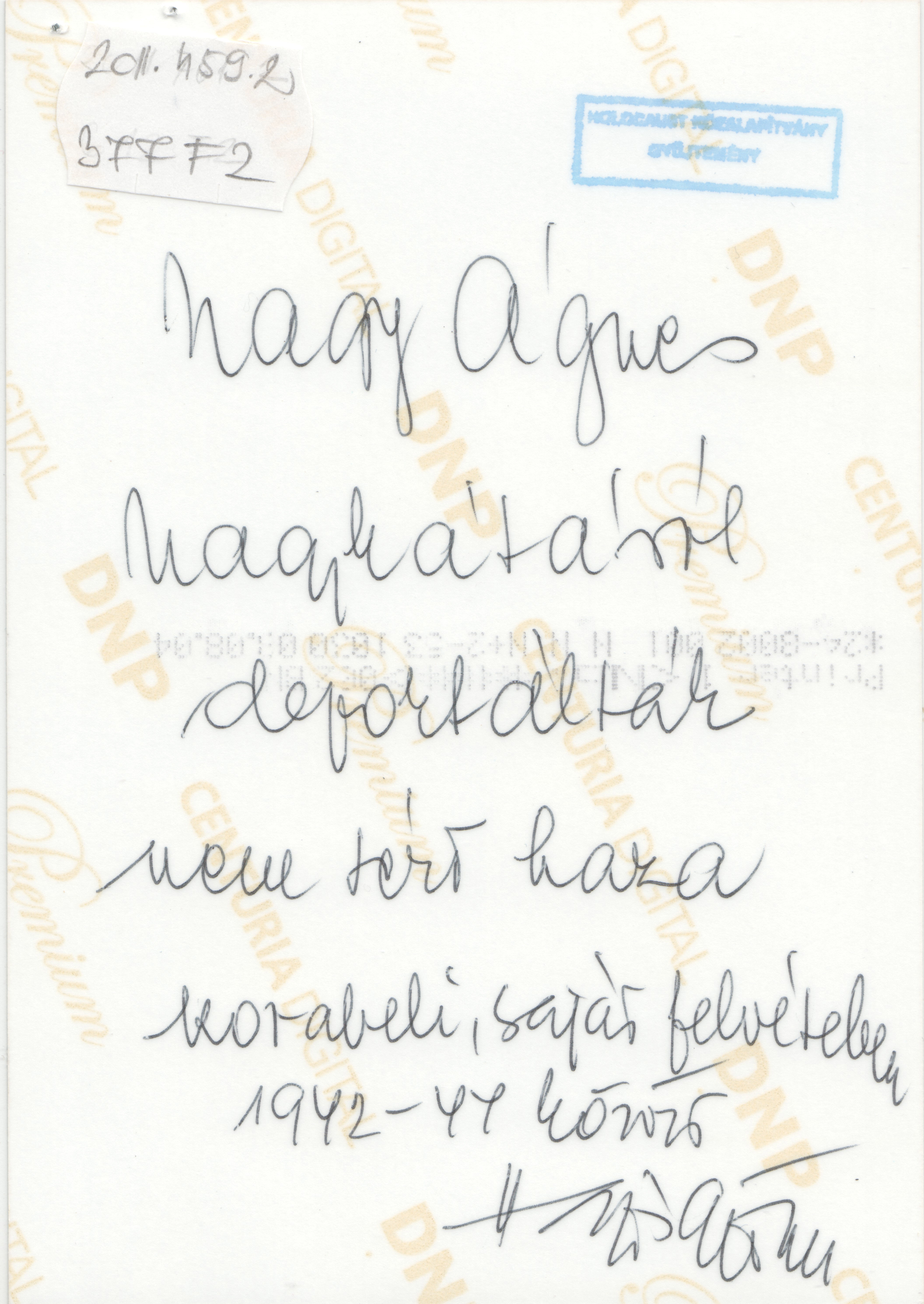 Nagy Ágnes képének hátoldalán kézzel írt szöveg