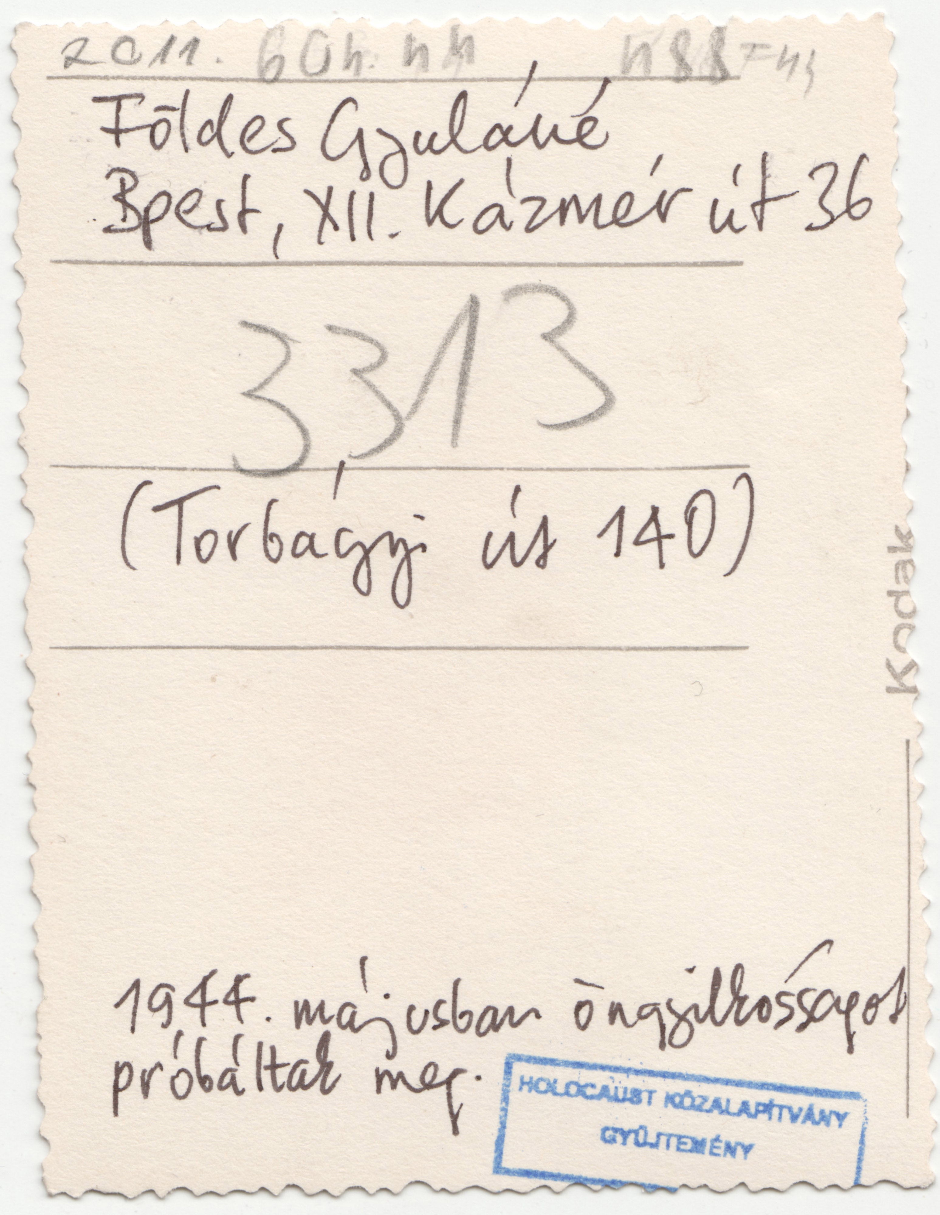 "Földes Gyuláné, Bpest, XII. Kázmér út 36 (Torbágyi út 140) 1944 májusban öngyilkosságot próbáltak meg."