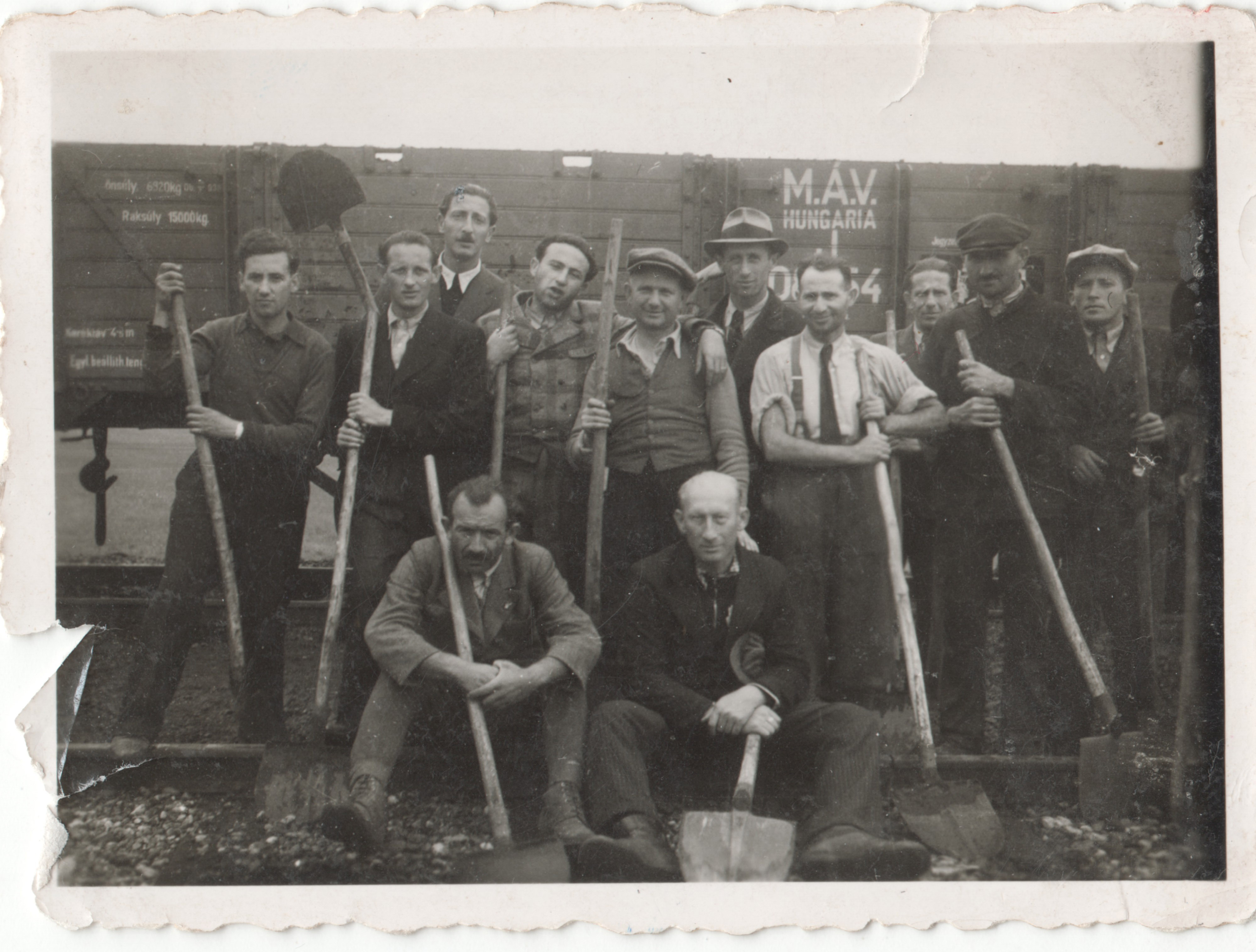 Rosenthal Jenő munkaszolgálatos csoportképen egy MÁV vagon előtt