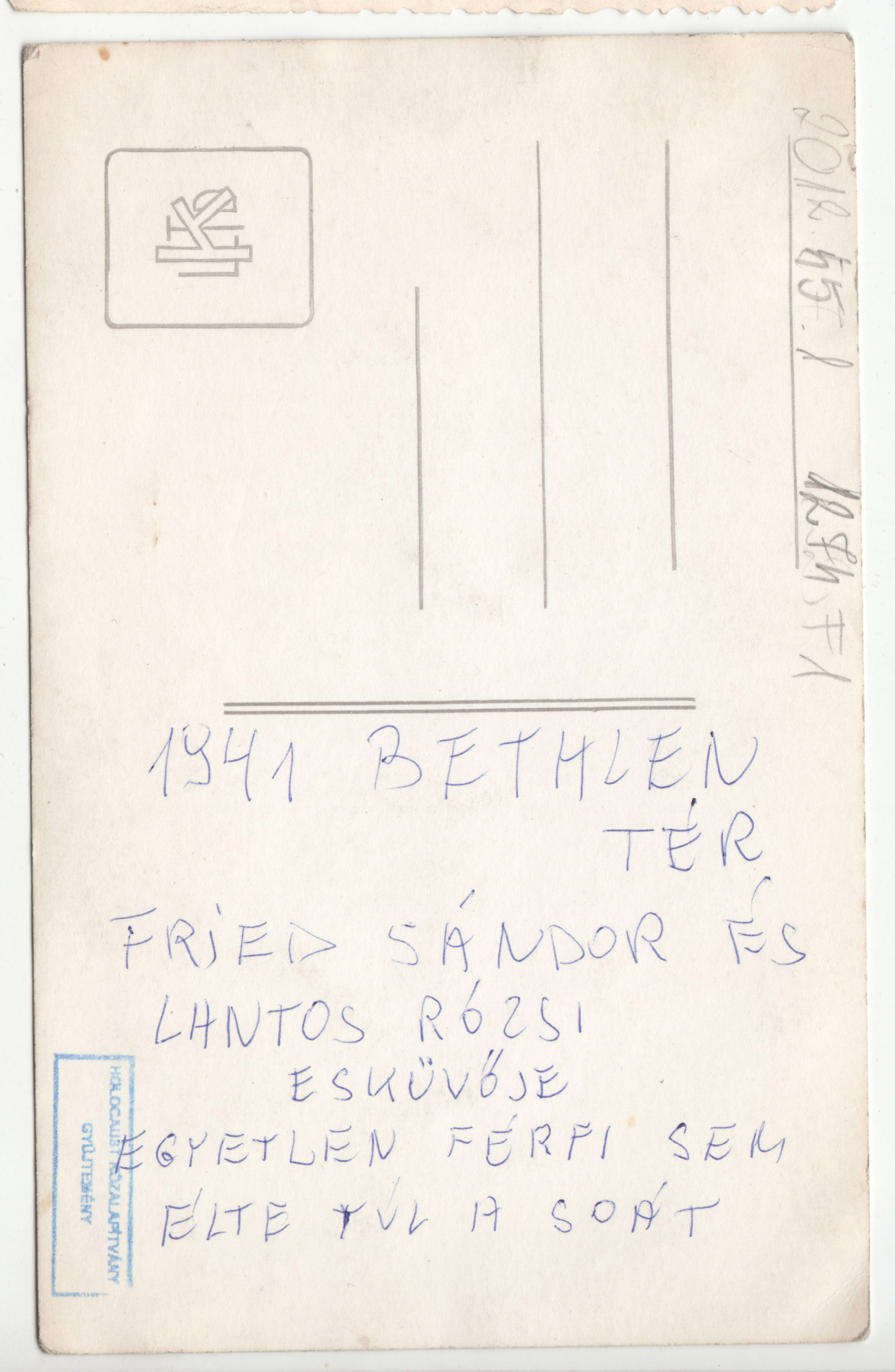 Fried Sándor és Lantos Rózsi esküvői csoportképén hátoldalán kézzel írt szöveg