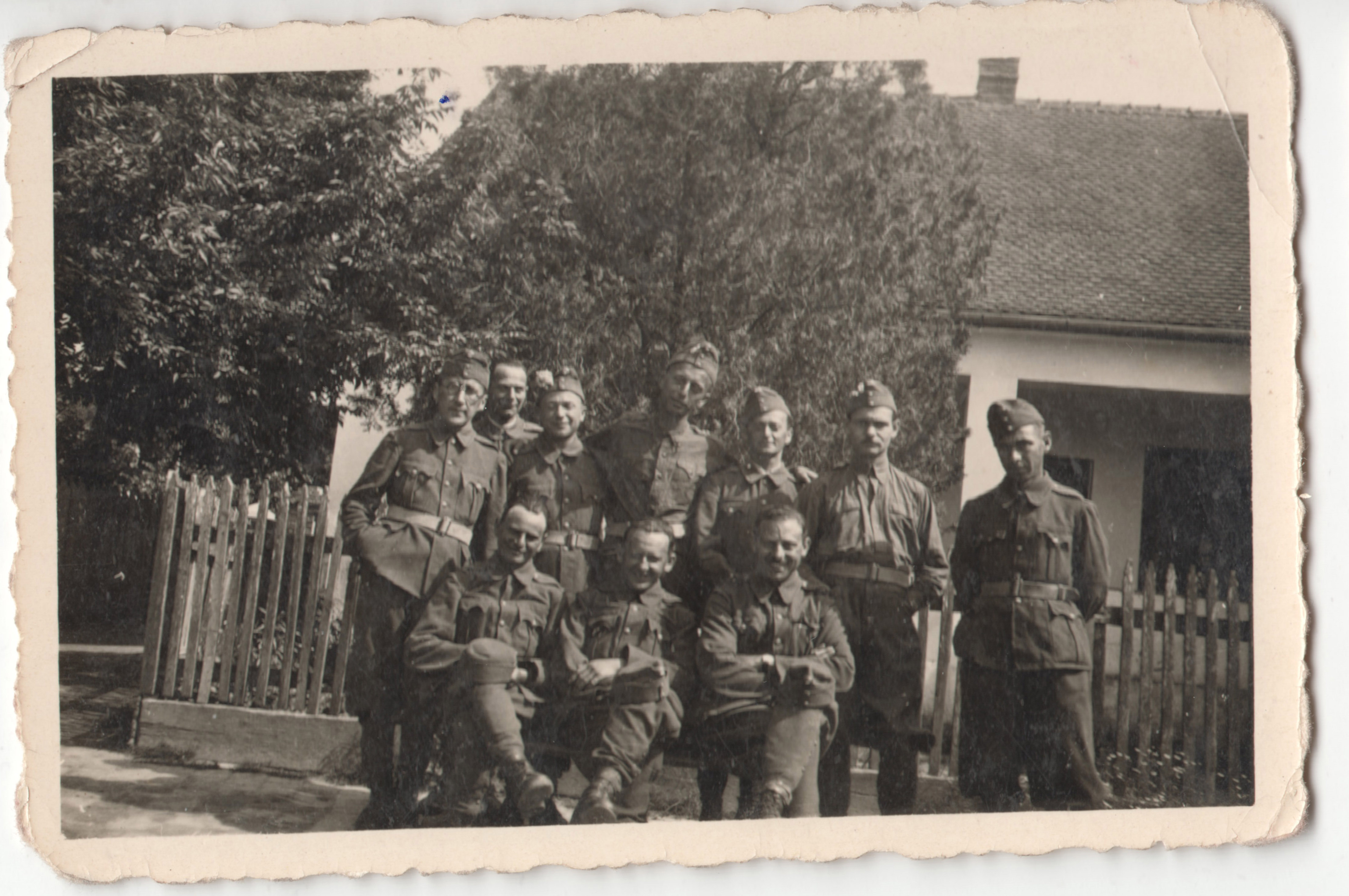 Munkaszolgálatos csoportkép, egész alakos felvétel, egyenruhában