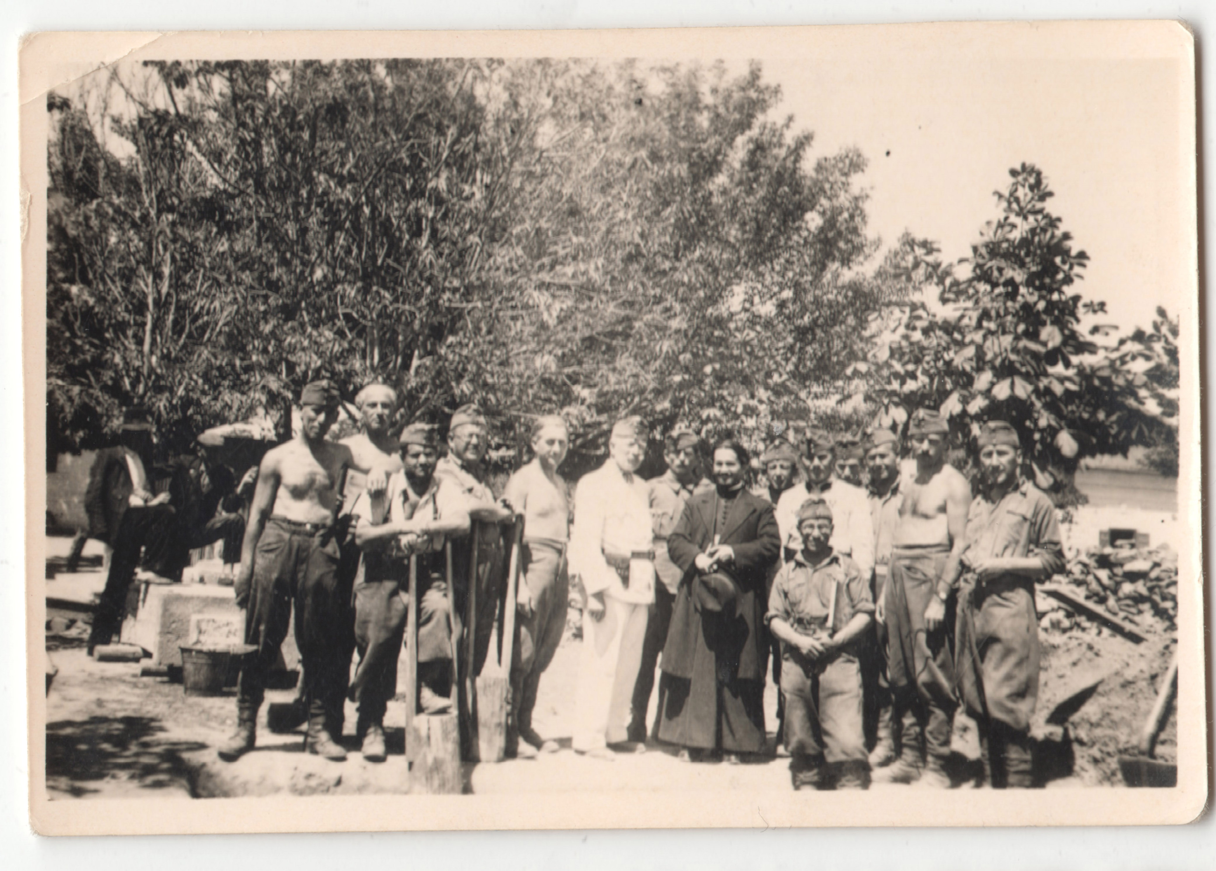Munkaszolgálatos csoportkép egy szerb pappal egy kereszt felállításakor