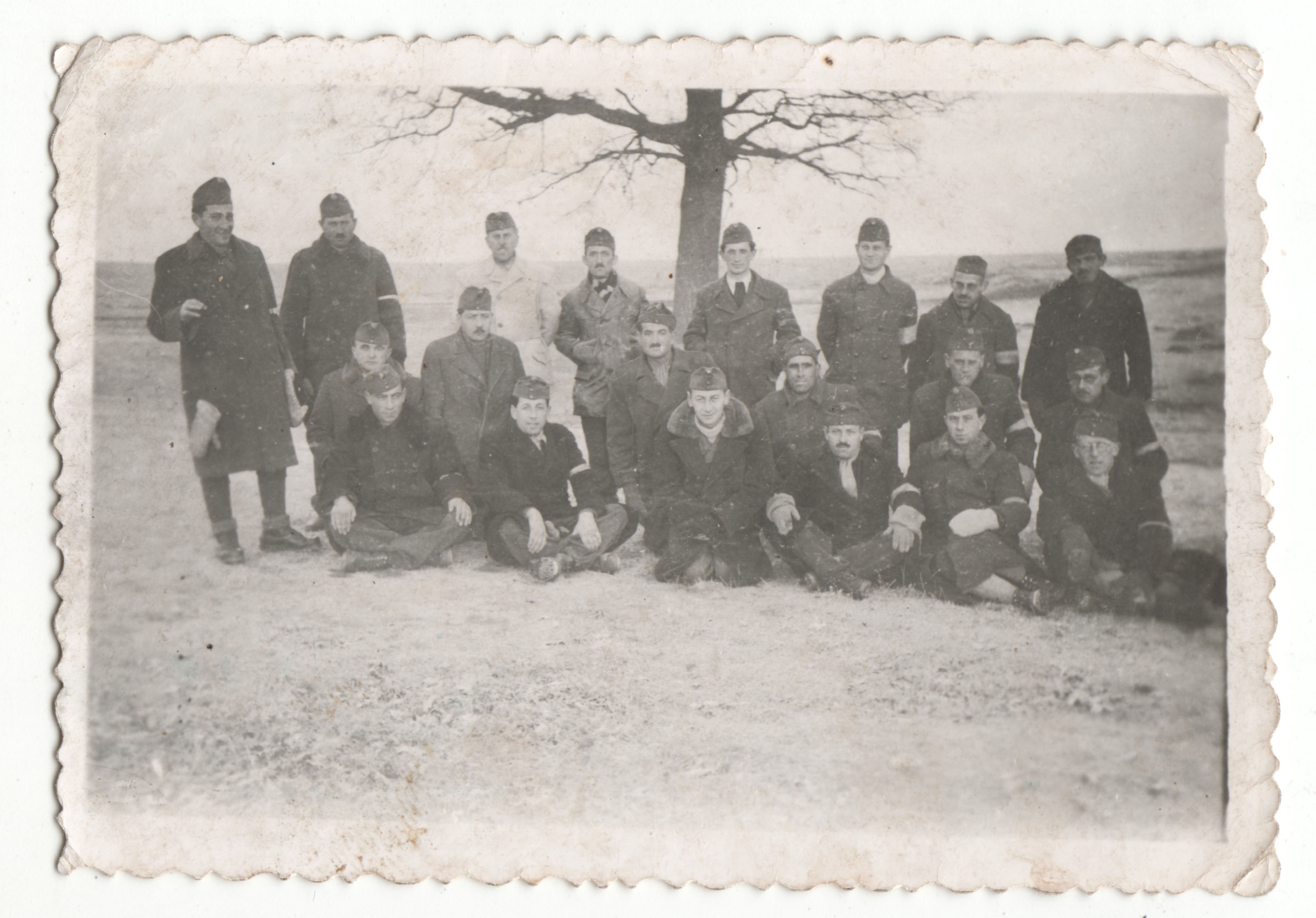 Csoportkép húsz munkaszolgálatos polgári ruhában, köztük Schwarcz Lajos