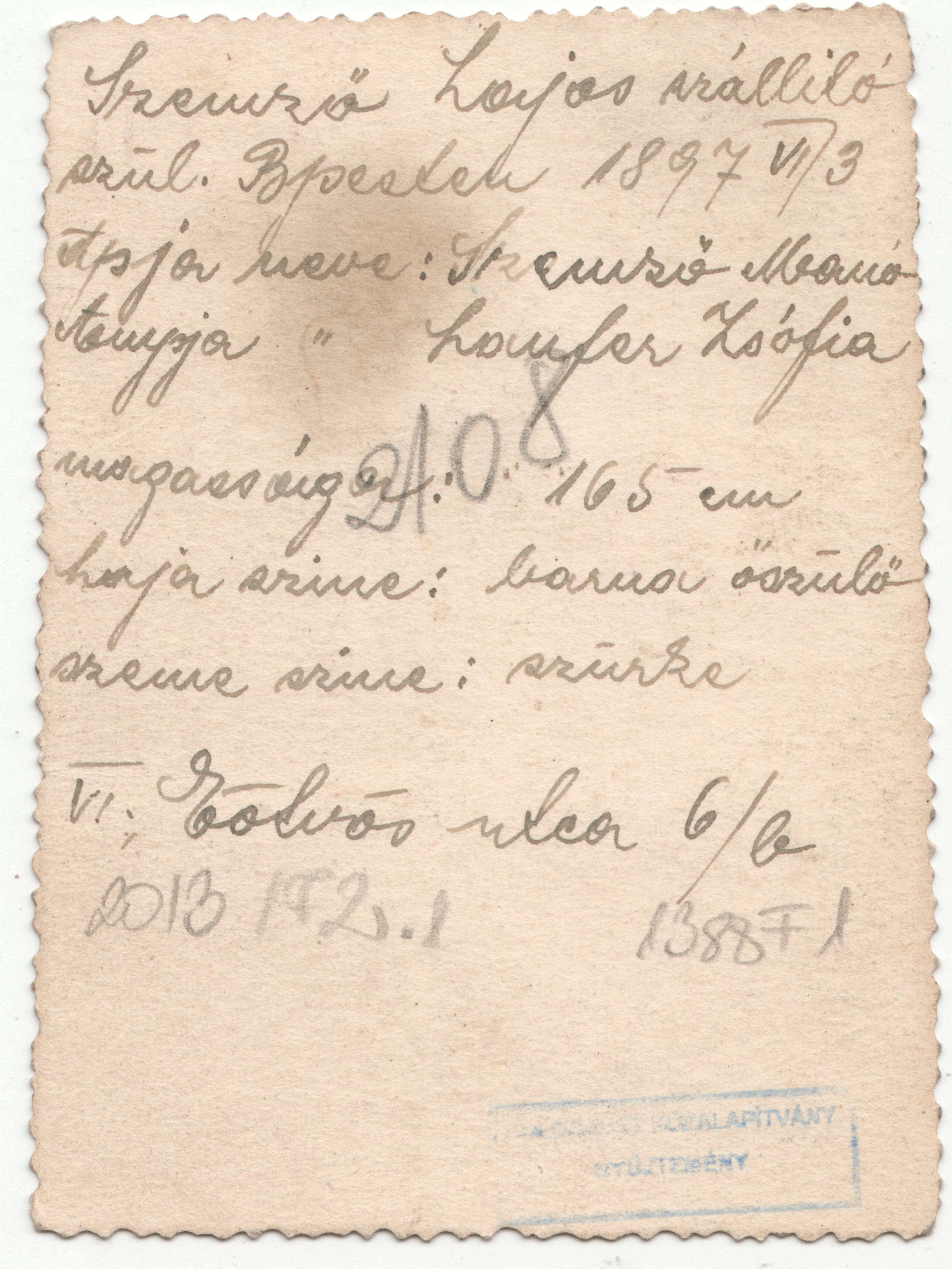 “Szemző Lajos szállító szül. Bpesten 1897 VI. 3 Apja neve: Szemző Manó Anyja neve: Laufer Zsófia magasság: 165 cm haja színe: barna őszülő szeme színe: szürke VI. Eötvös utca 6/b.”