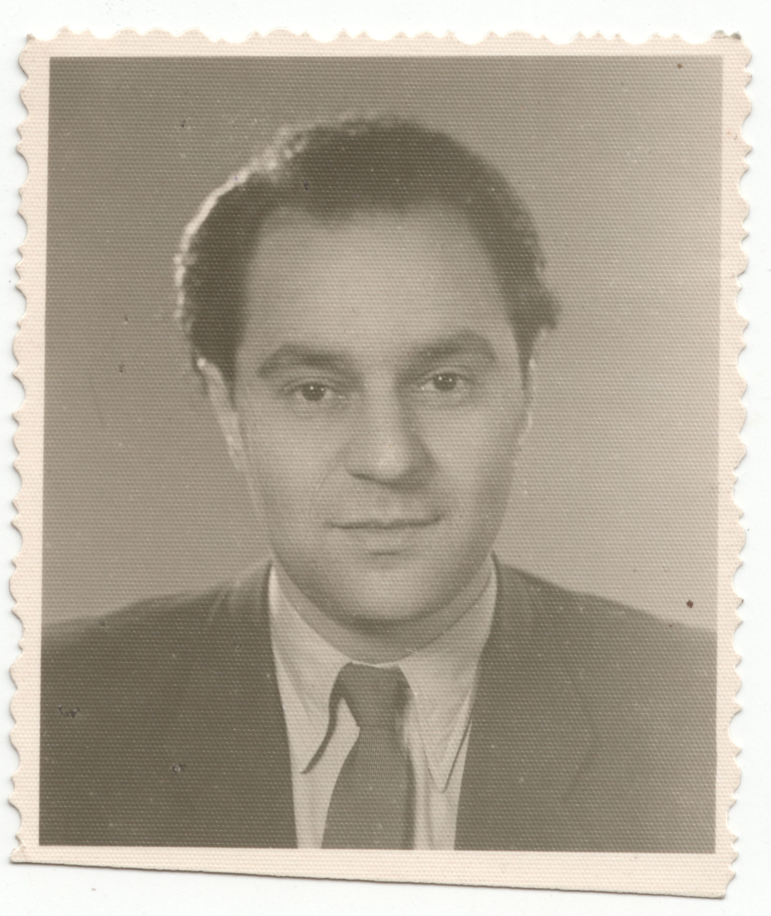 Igazolványkép Gerő Andorról (1914-2012), melyen öltönyben, nyakkendőben látható, hátoldalán feljegyzés személyi adatairól és a budapesti rendőrség pecsétje.