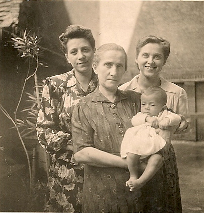 Balról jobbra: Weisz Adél édesanyám, Weisz Zsigmondné Grósz Lina anyai nagyanyám, Rosenberg Ágnes nővérem pólyában, Kőnigsberg Ilona édesanyám sógornője. 1944.03.15-én született nővérem, pólyában látható. 1944.03.19-én jöttek be a németek. 1944. tavasz végén, nyár elején készülhetett a kép. 1944-ben, pontosan nem tudom mikor és hová, édesanyám és nővérem, védett házba kerültek. 1945. januárjábanban vagy februárjábanban, édesanyám és nővérem, kijöttek a védett házból. Nagymamámat nem találták meg. Nagy eséllyel a nyilasok vitték el, mert semmilyen dokumentációt nem találtam róla. Nagymamám akkor a VII. kerület Kazynczy utca 30-ban lakott.