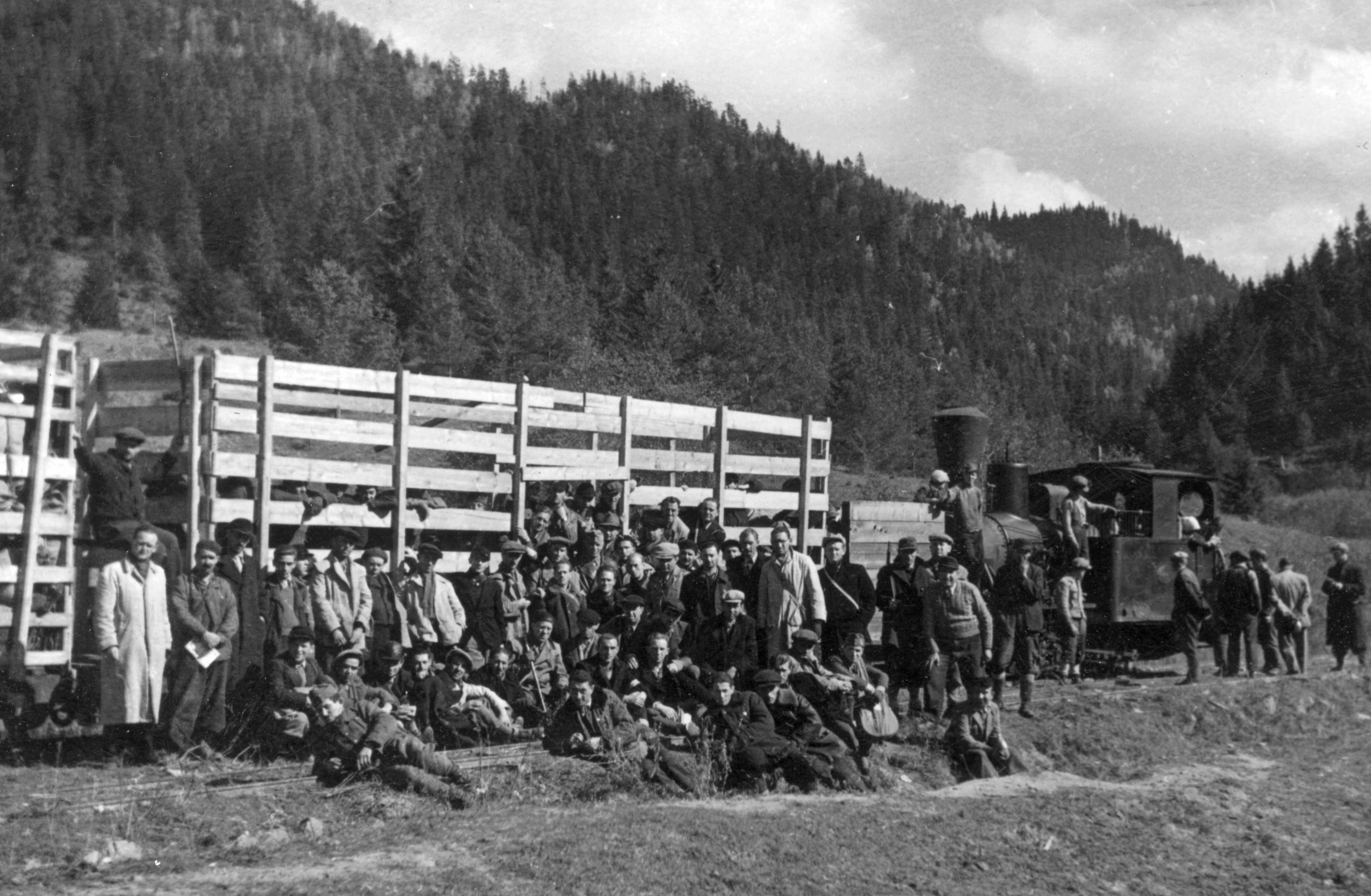 Úzvölgyi munkaszolgálatosok csoportkép mozdonnyal