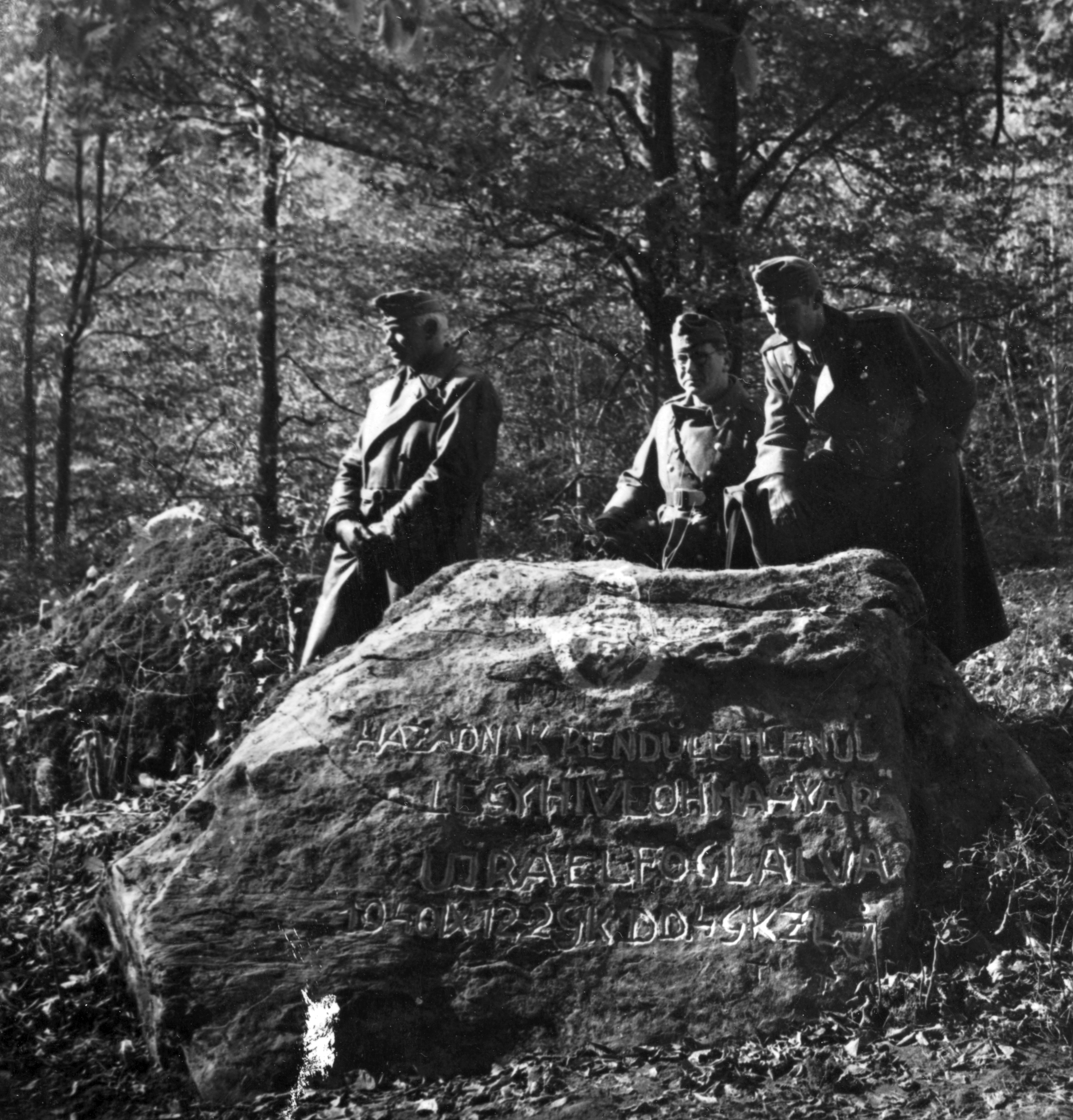 Három egyenruhás férfi az úzvölgyi emlékkőnél