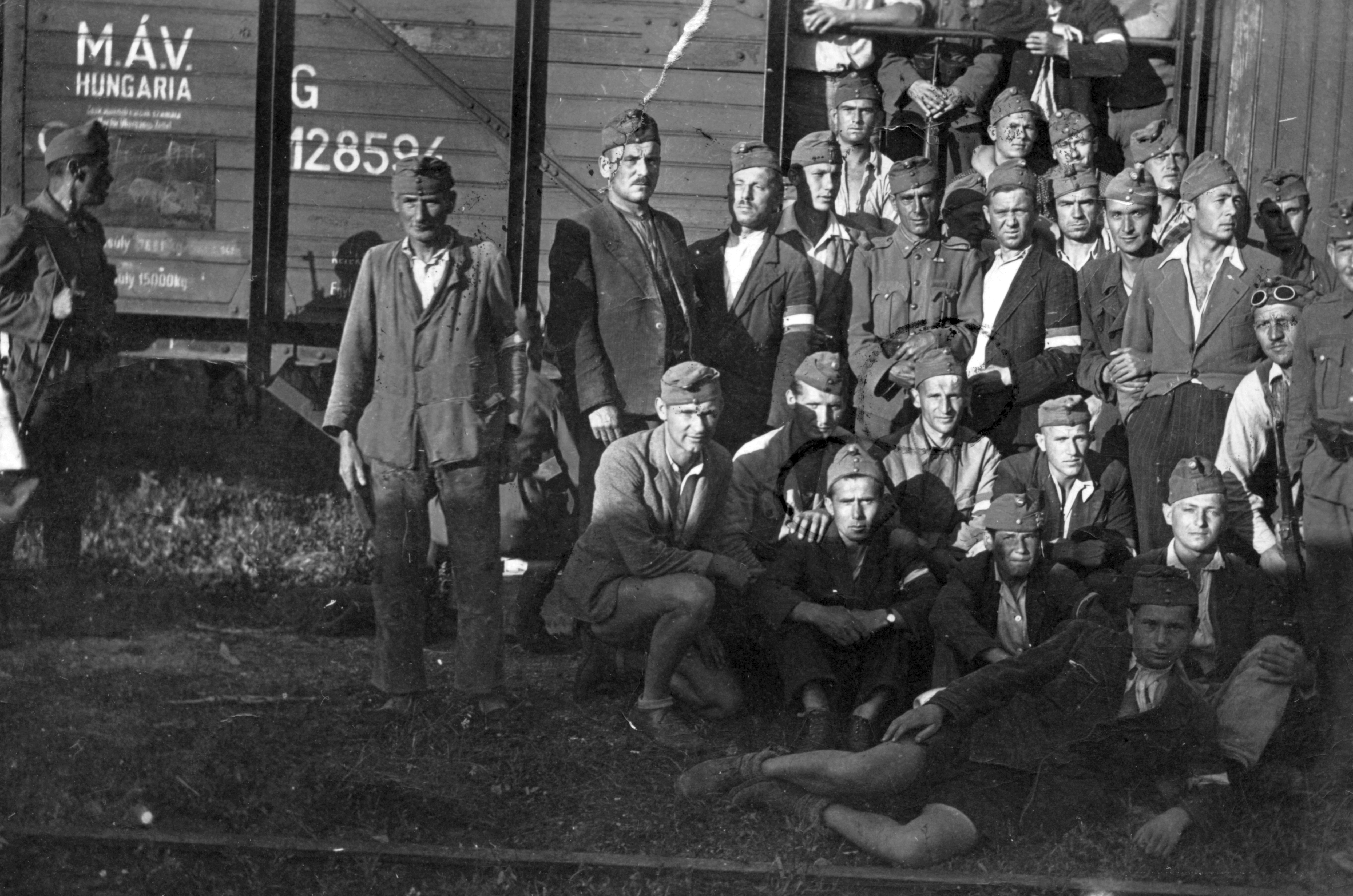 Munkaszolgálatosok vonatkocsi előtt