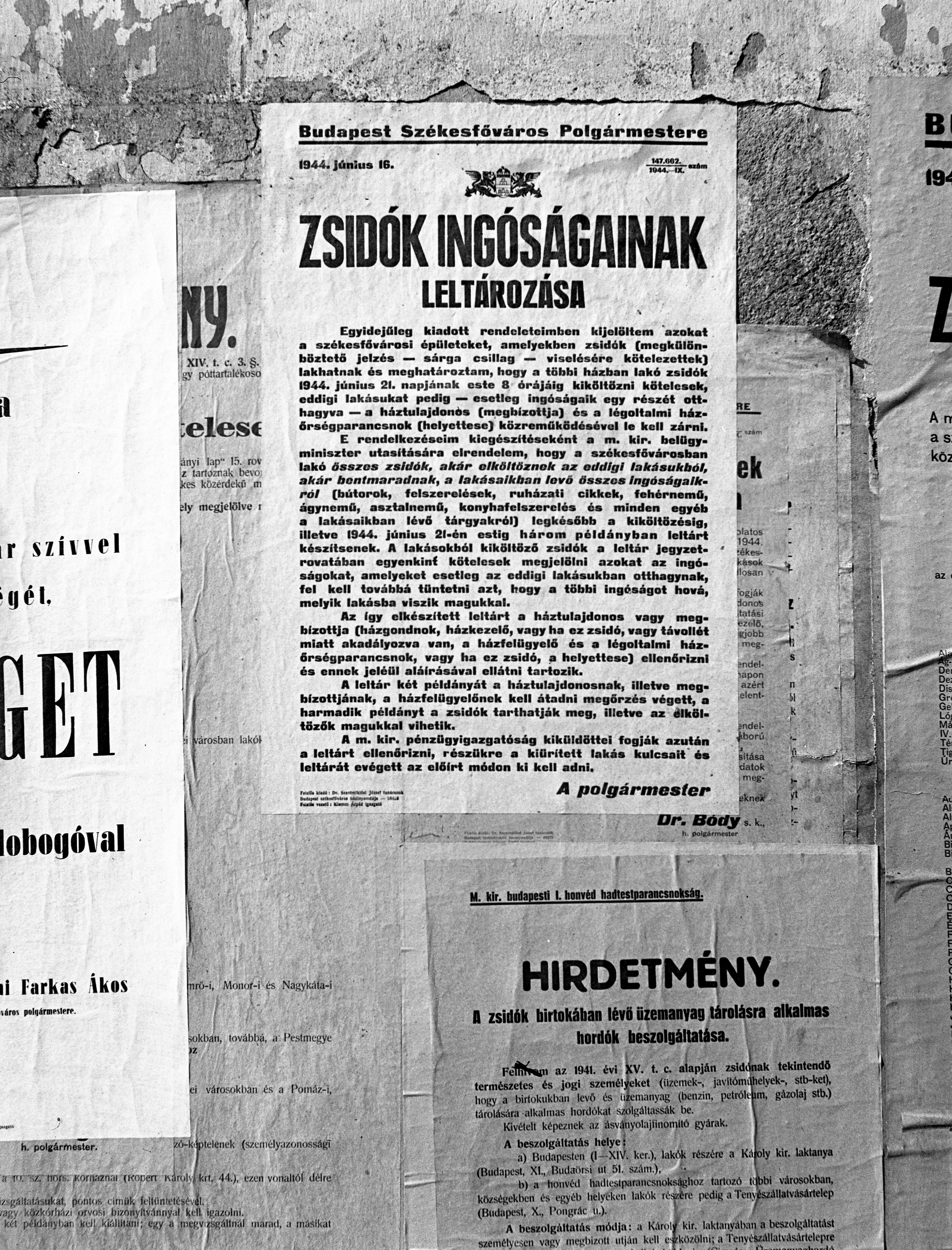 Photo of a poster of the Budapest mayoral decree of 16 June 1944. This required all those defined as Jews to make a full inventory of their property (furniture, equipment, clothing, underwear, bedding, tableware, kitchen equipment and all other articles at home) to be submitted in three copies by 21 June to the building owner or concierge.