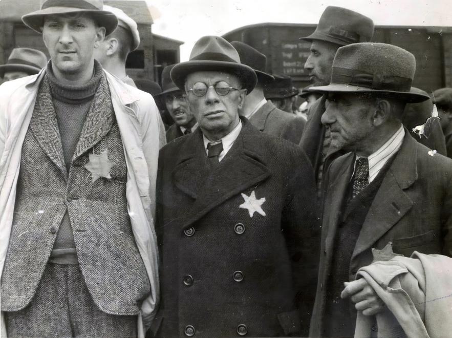 Csoportosításra váró férfiak sárga csillaggal, Auschwitz-Birkenau