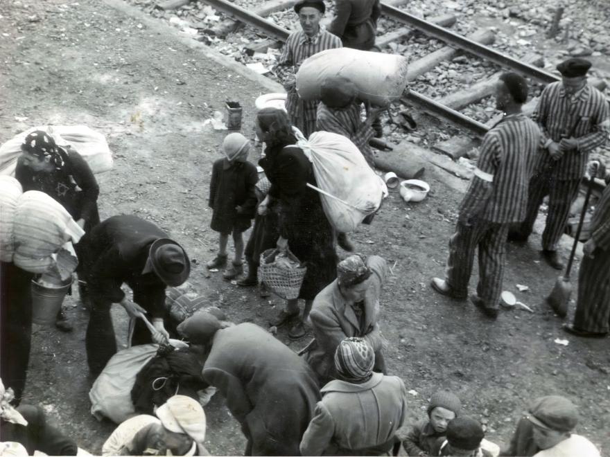 Rabok és újonnan érkezők a vasúti sínek mellett, Auschwitz-Birkenau