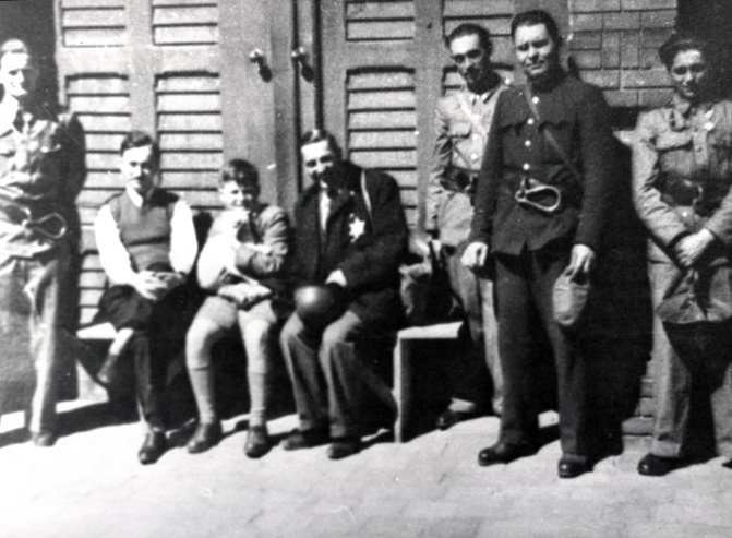 A Goldberger gyár (?) tűzoltói. Köztük egy sárga csillagot viselő férfi: Gerrai (Glück) Zoltán