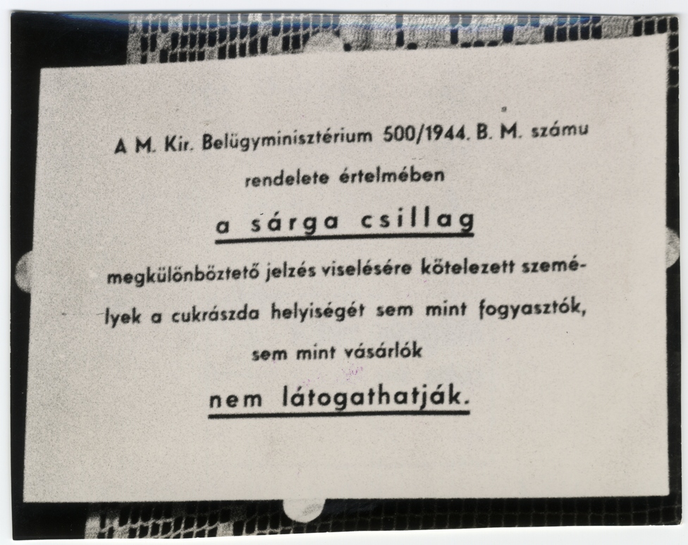 Zsidók kiszolgálását tiltó felirat egy cukrászda ajtaján