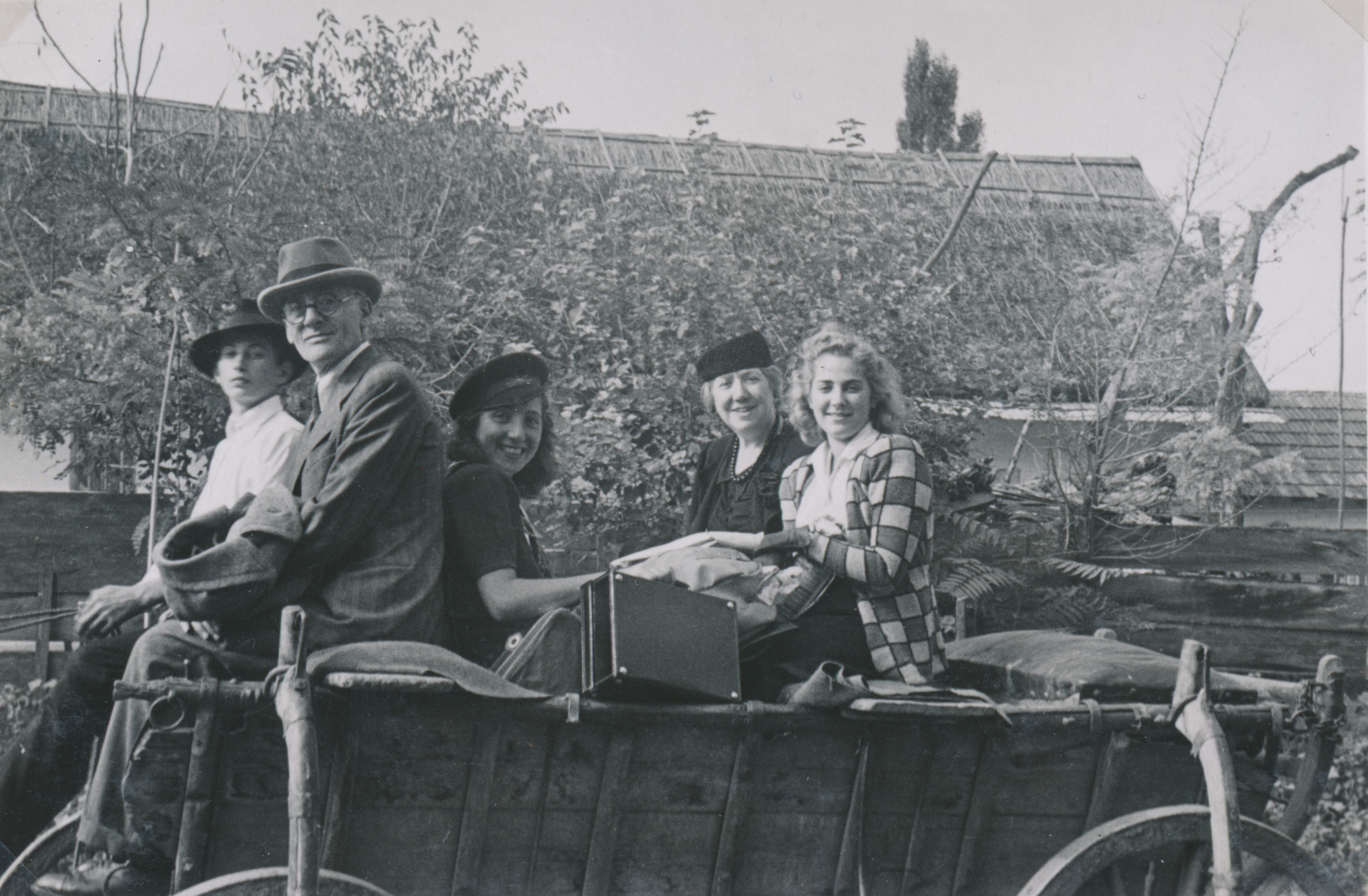 Csoportkép öt emberről egy lovasszekéren, akik munkaszolgálatosokat látogatnak