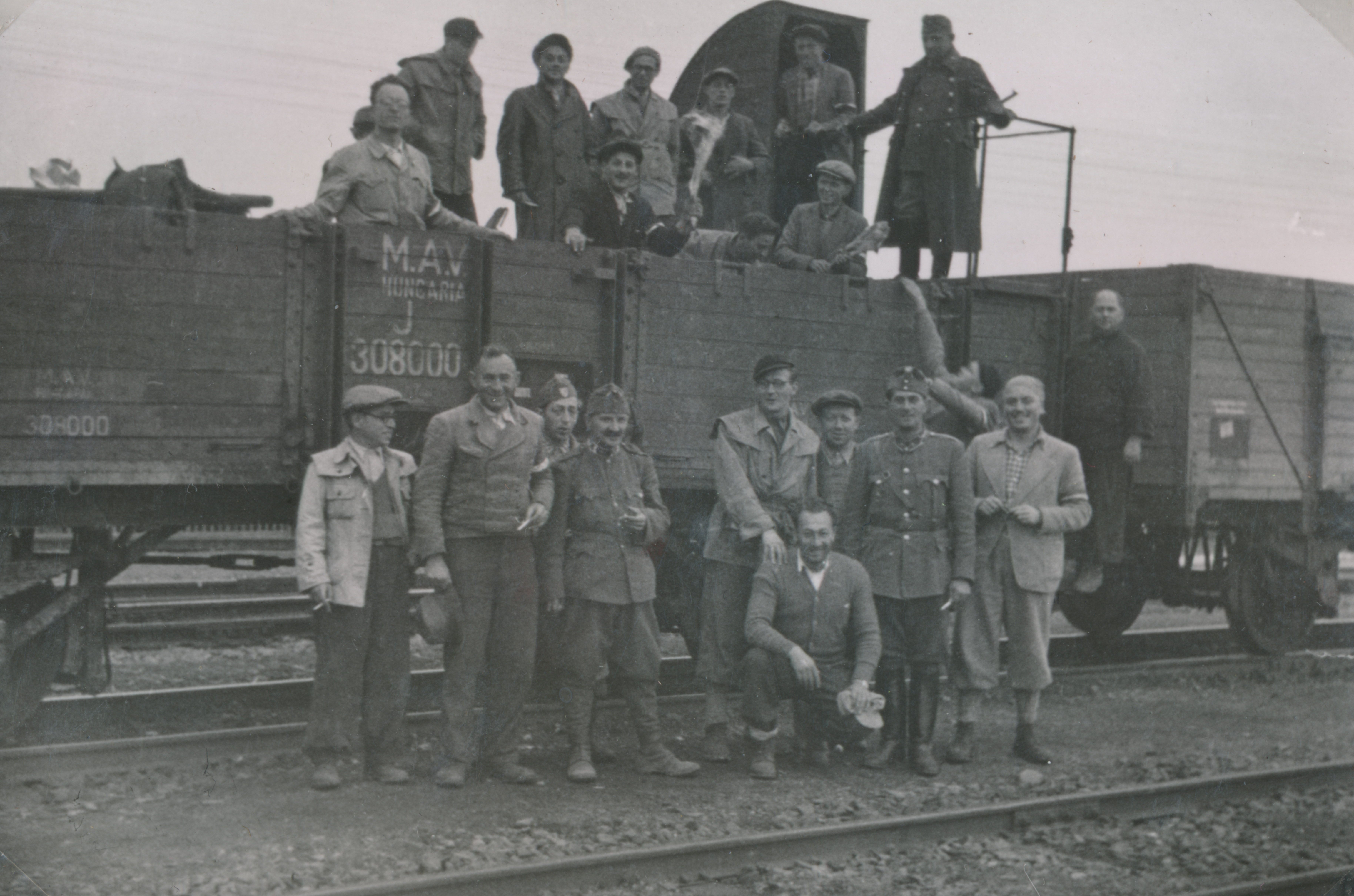 Csoportkép vasúti kocsikban és előttük álló munkszolgálatosokról