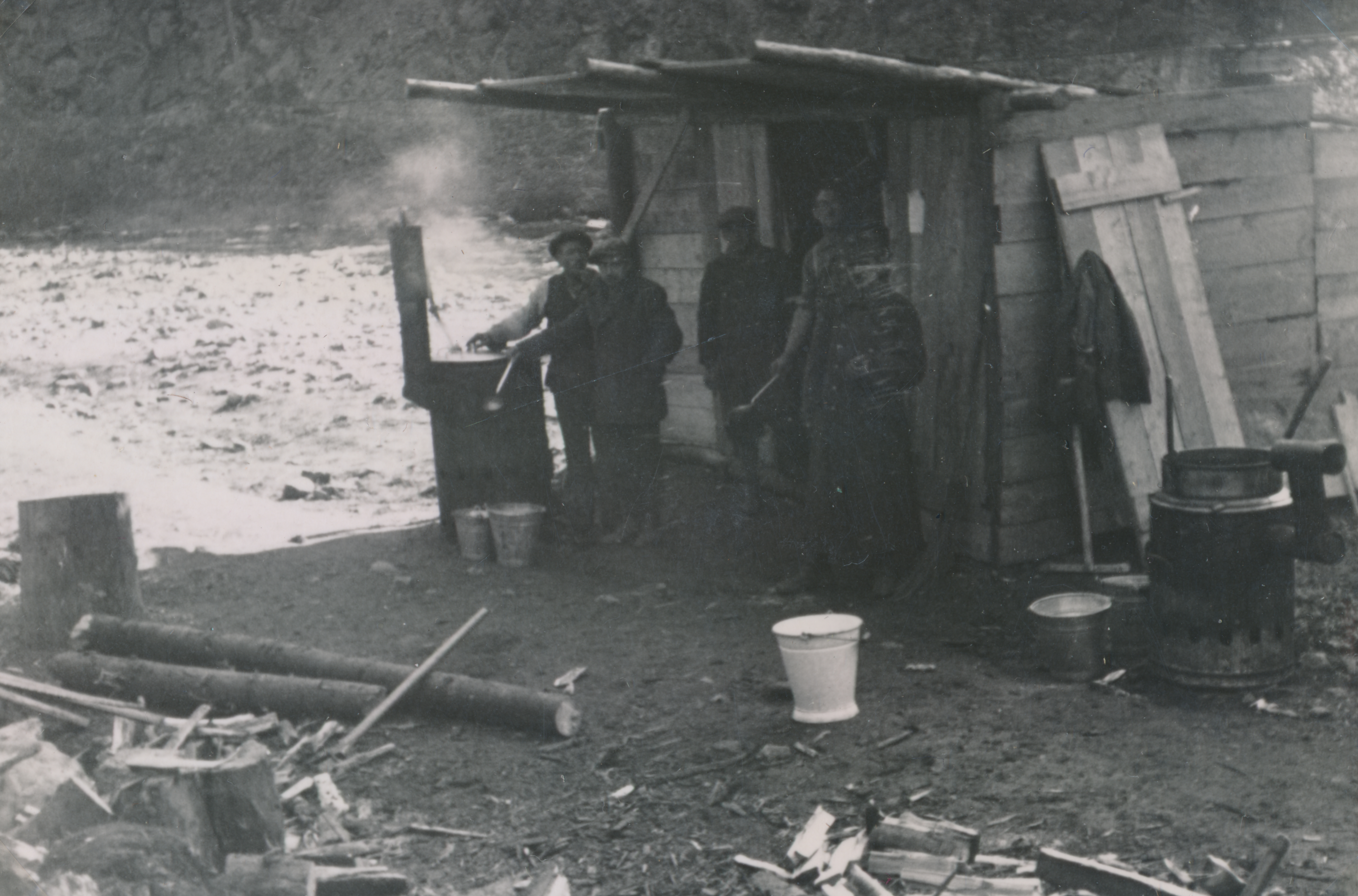 Munkaszolgálatosok főznek egy kunyhó előtt