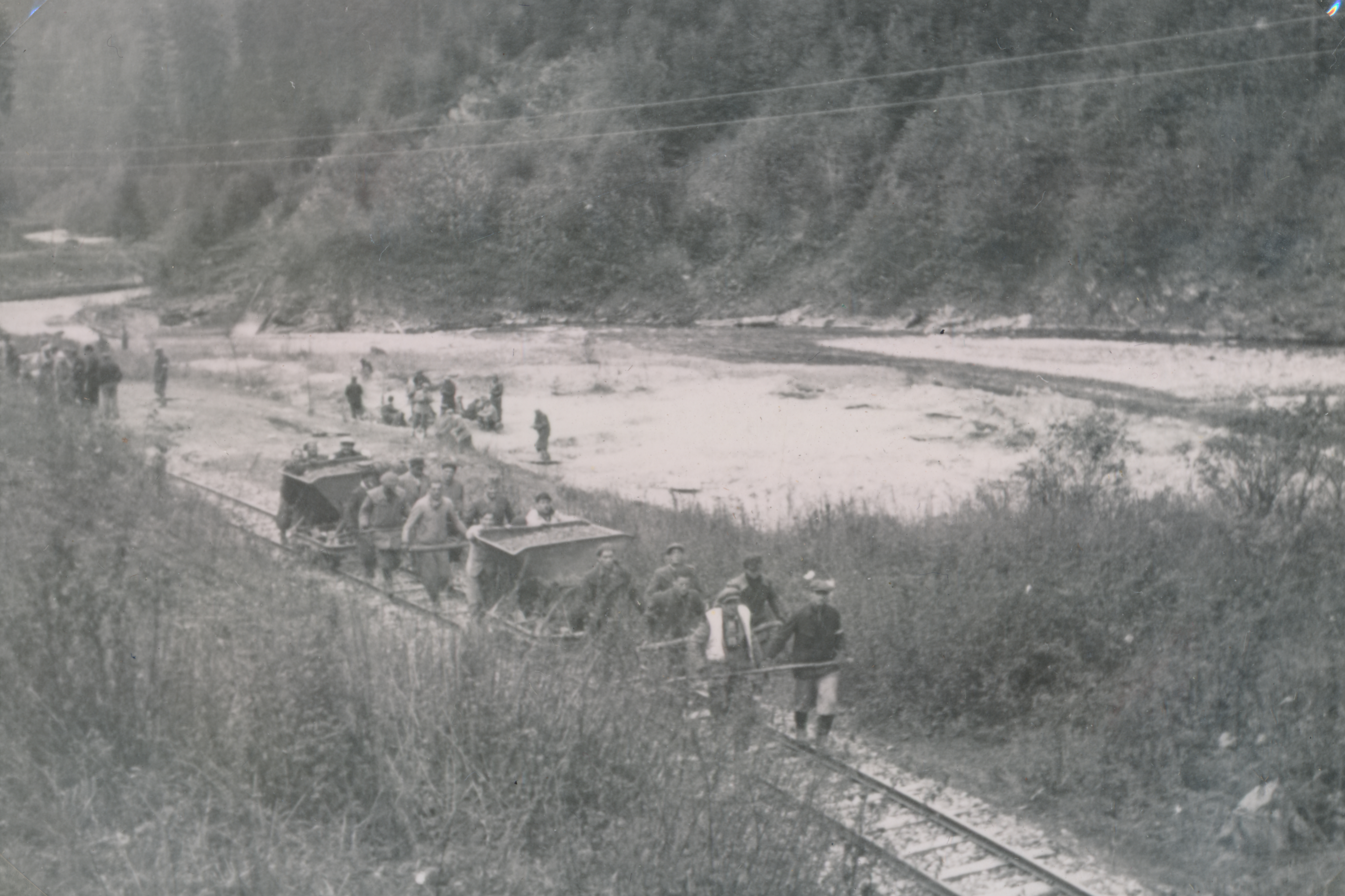 Munkaszolgálatosok sóderrel teli csilléket húznak