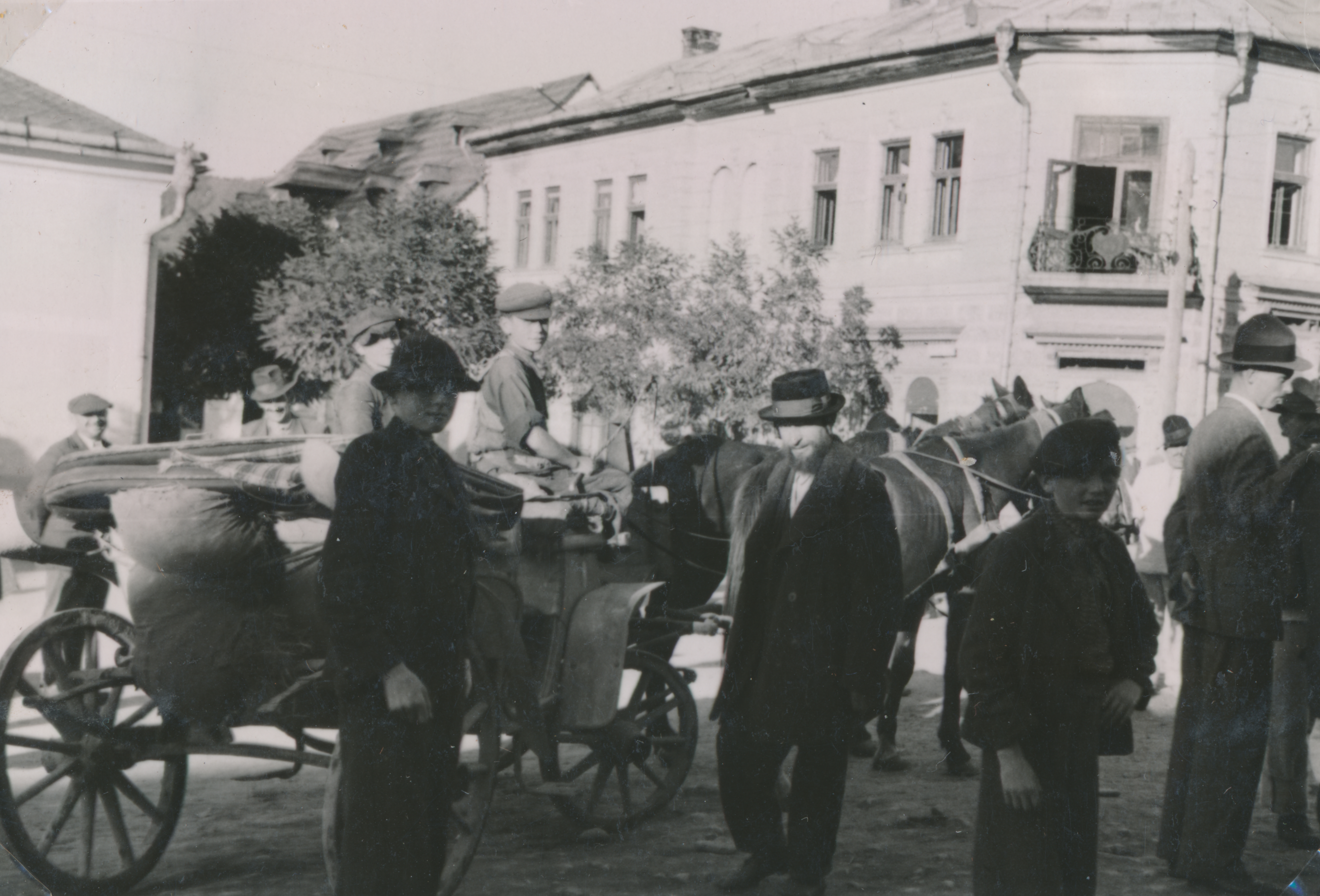 Utcakép lovaskocsival és gyalogosokkal
