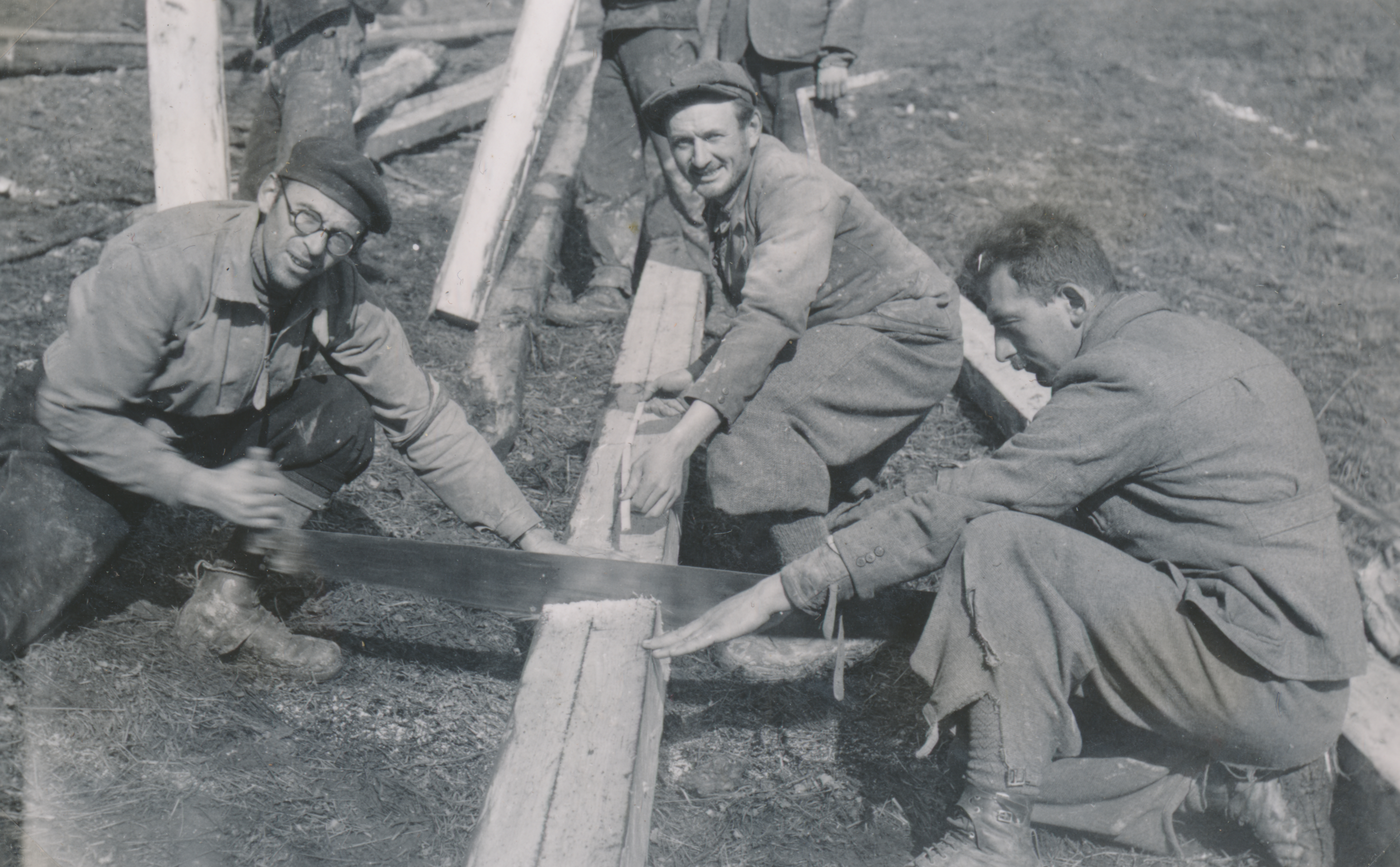 Három munkaszolgálatos egy fagerendát fűrészel