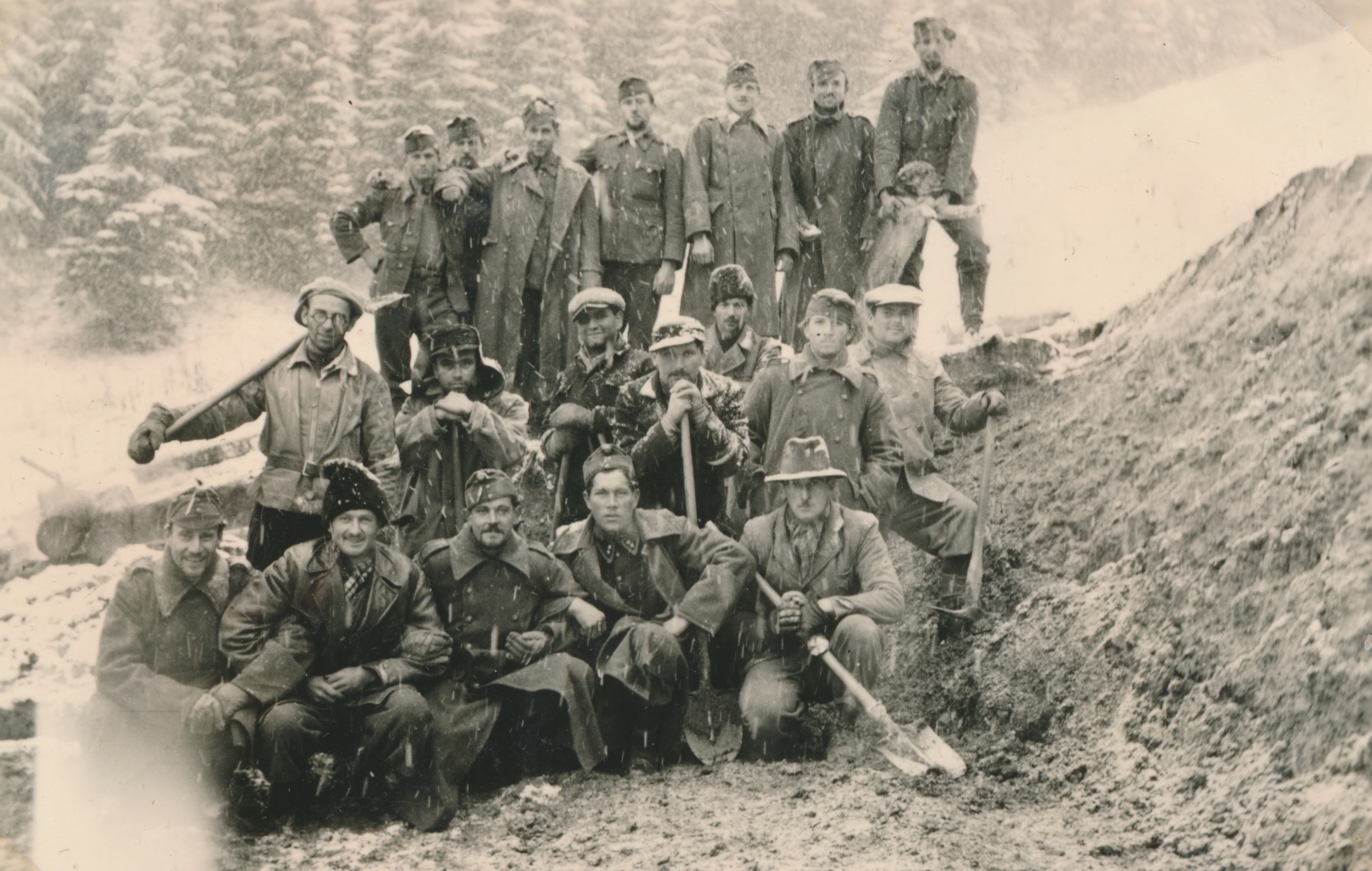 Csoportkép munkaszolgálatosokról szerszámaikkal télen