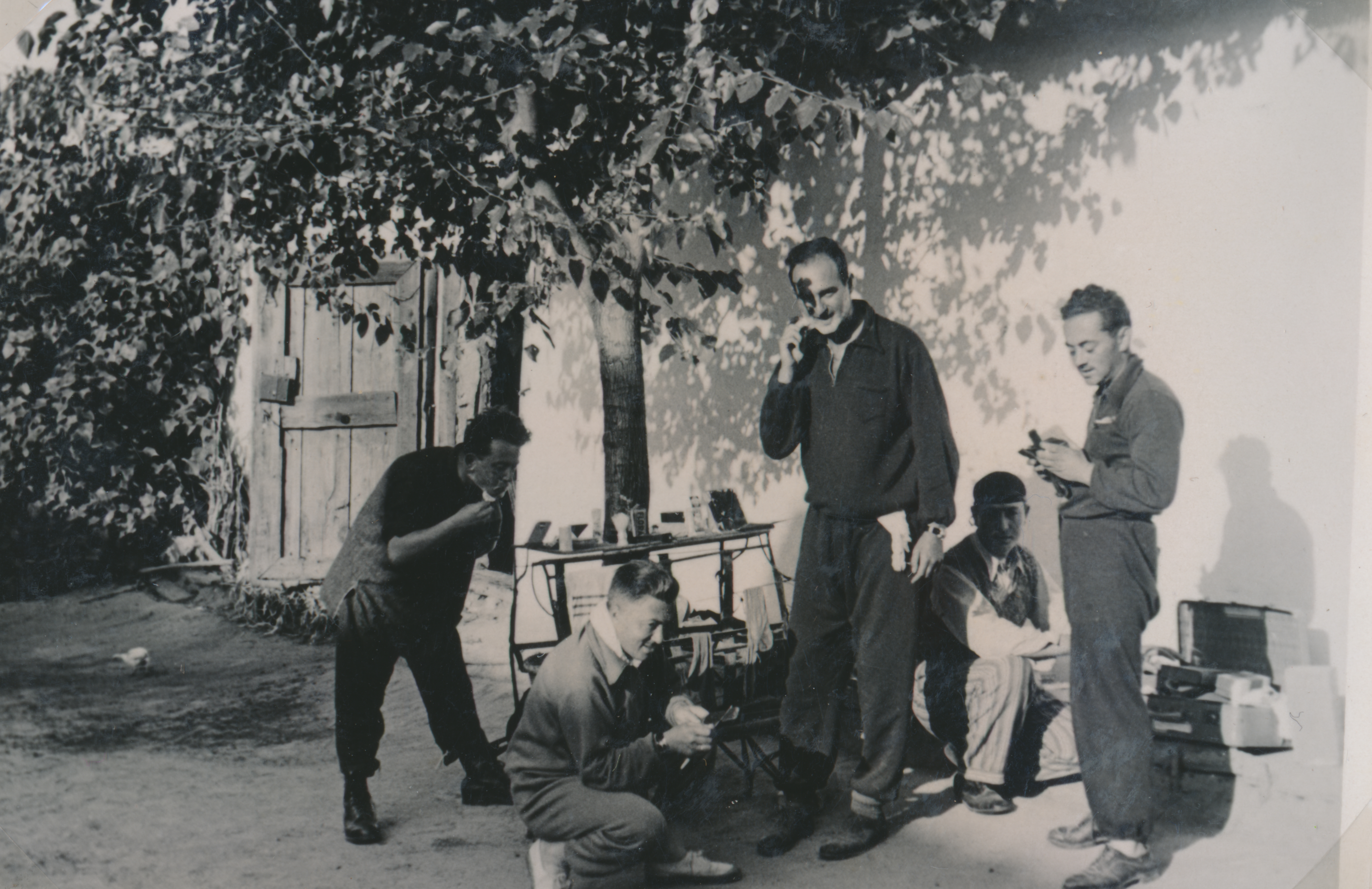 Öt munkaszolgálatos borotválkozik és ül egy kertben