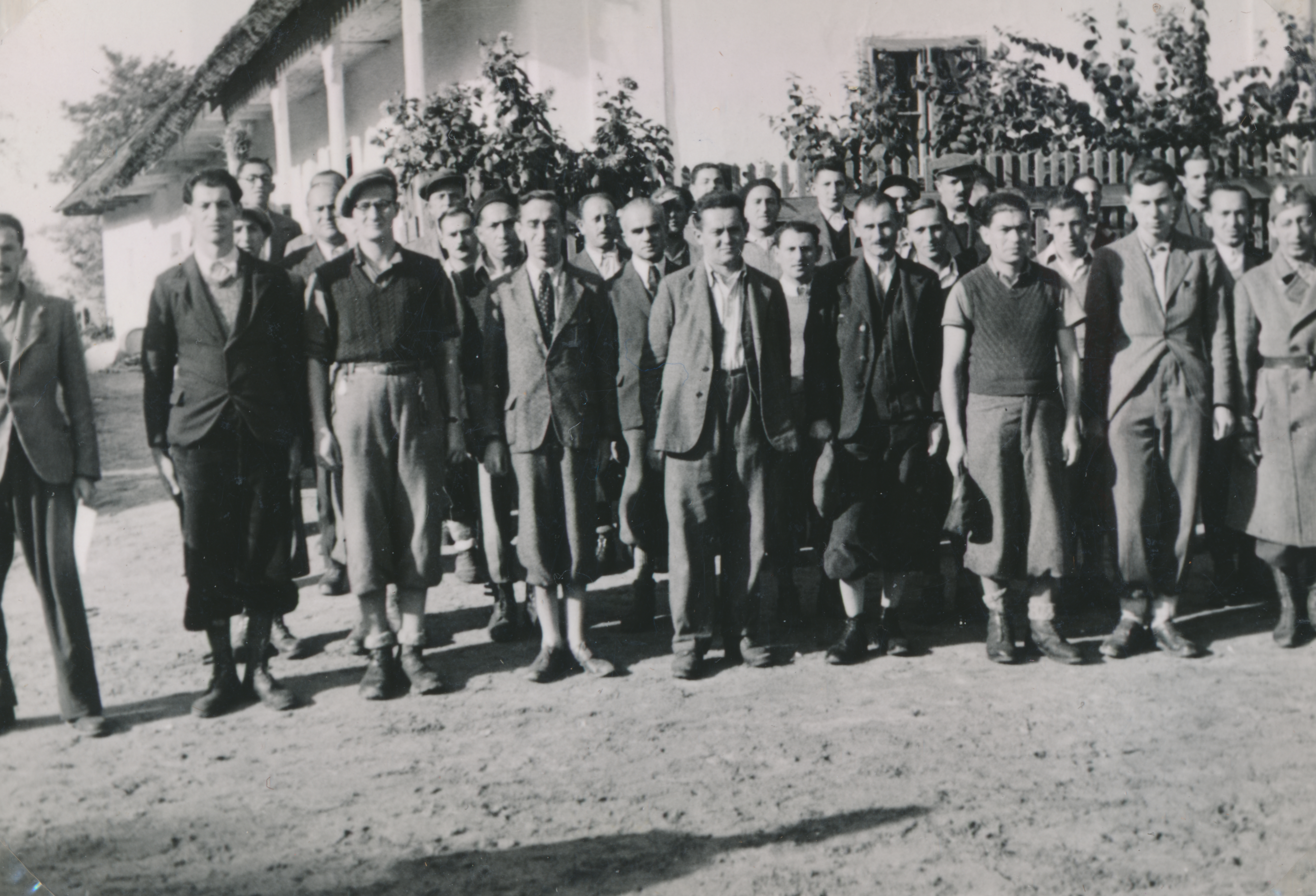 Munkaszolgálatosok (3. század) sorakozója az utcán egy tornácos ház előtt