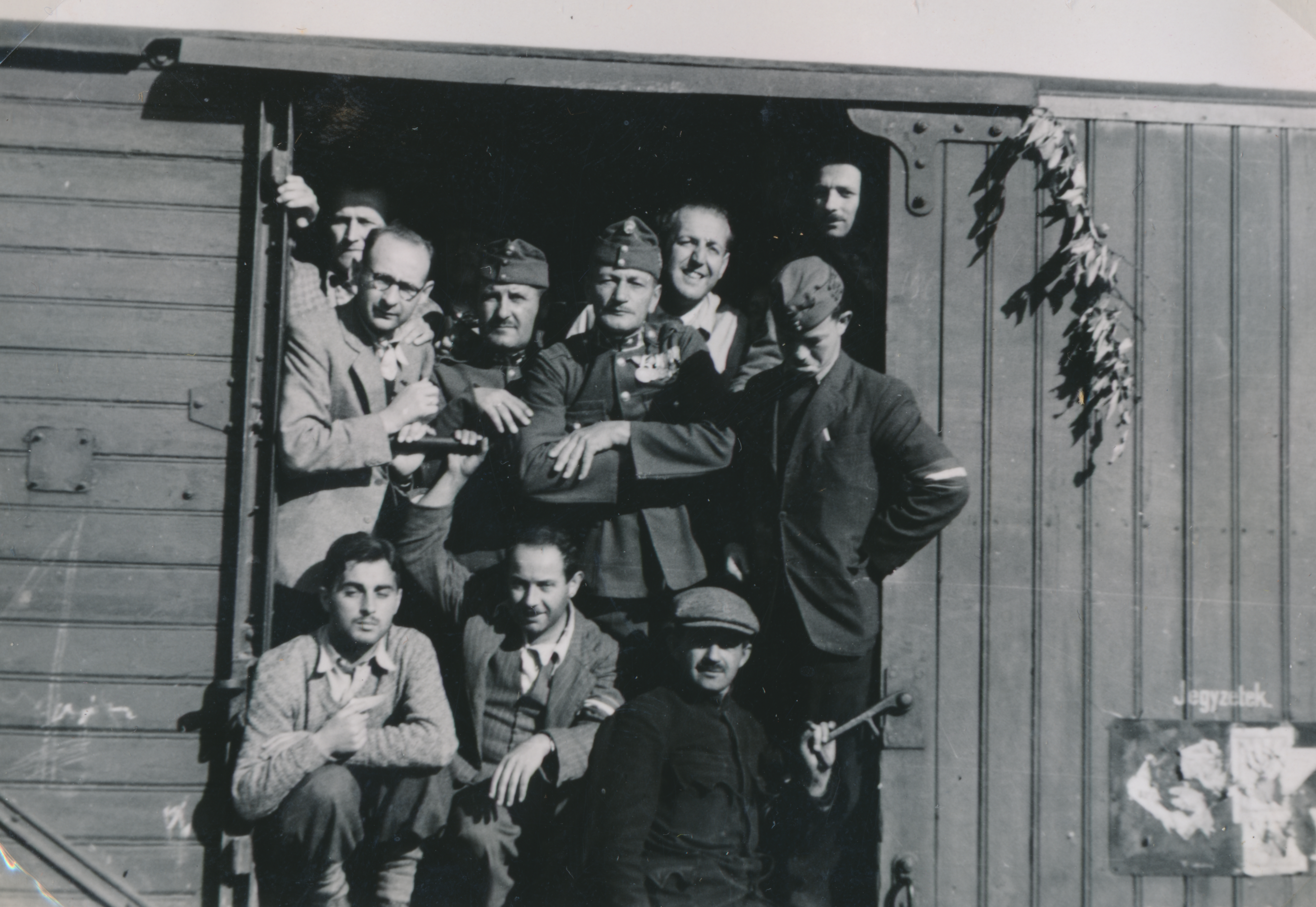 Csoportkép munkaszolgálatosokról és tisztekről egy marhavagonban